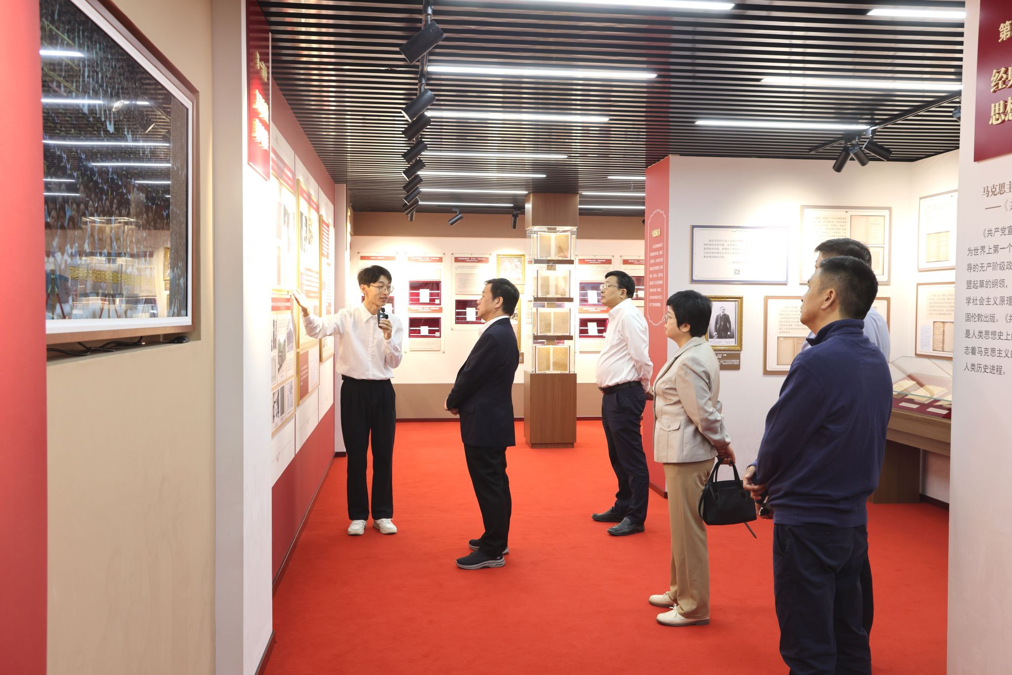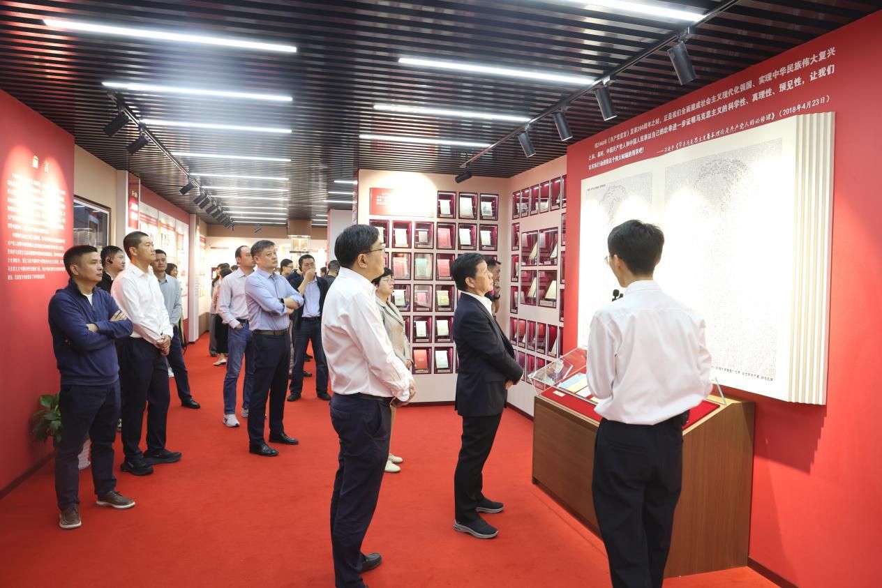 作为本次系列展览的核心展区,该展以“两个结合”为主题,分 “真理力量 薪火相传”“手稿藏书 经久弥珍”“经典巨著 思想丰碑”“‘两个结合’最大法宝”四个部分,共展出400余件展品,其中包括首次公开的马克思、恩格斯原始手稿等珍贵稿件。现场通过实体文献、译文说明、历史照片搭配互动屏的立体化呈现方式,生动还原马克思主义在中国的传播与发展历程。讲解员郑文彬则结合展品背后的历史故事,为参观团深入解读马克思主义理论的思想内涵与时代价值。