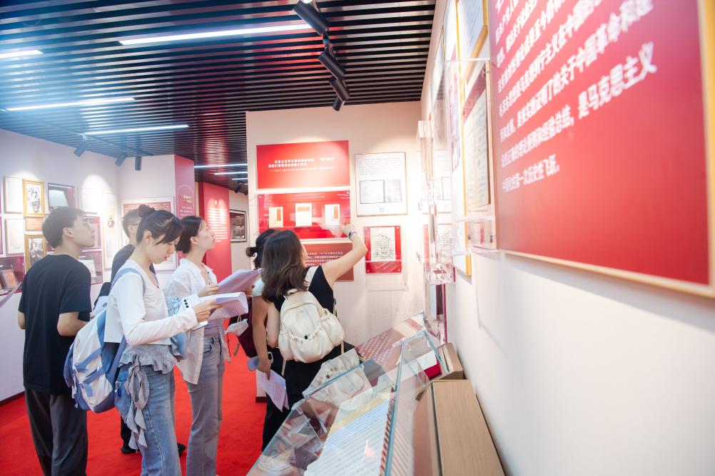 走进华中师范大学文科科研楼北楼马克思主义学院二楼展厅,柔和的灯光漫过展台和展板,400余件马克思主义经典著作、宣传马克思主义的书籍和马克思、恩格斯的手稿等文献资料陈列其中。从泛黄书页上的精辟论断,到不同语种、版本文献见证的思想跨越山海传播,再到早期共产主义者笔力遒劲的翻译手稿……展览以丰富的手稿和藏书等实物形式,勾勒出一条清晰而壮阔的马克思主义思想发展脉络,吸引了不少师生驻足凝视,俯首近观,静心感悟。厚重的历史感深深感染了每一位参观者,他们或仔细观看,或低声交流,有的还不时记录。