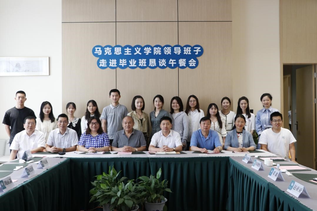 马克思主义学院讯(通讯员 张志庭;摄影 蒙甜)为贯彻落实湖北省委关于开展党员干部下基层察民情解民忧暖民心实践活动,根据学校党委部署,马克思主义学院党委率先行动,6月2日上午,学院党委书记孙永祥、院长万美容、正处职组织员董俊敏、党委副书记邵莉莉、副院长李芳、毛华兵、邵彦涛及学院办公室主任季志勇等与学院本研毕业班14名学生代表在桂香园三楼桂花厅共享午餐,了解毕业生就业情况,倾听学生们的建议和需求,并就学院的管理以及学习、生活进行了深入探讨。“马克思主义学院领导班子走进毕业班恳谈午餐会”由邵莉莉主持。
