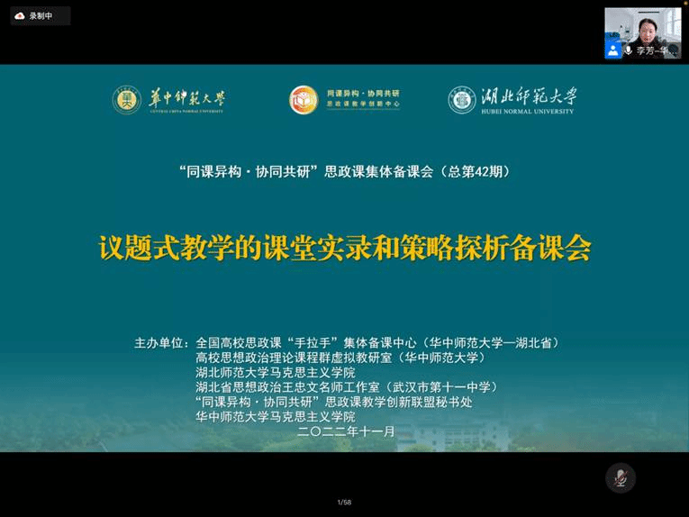 马克思主义学院讯(通讯员 袁润)为深入推进大中小学思政课一体化建设,115日,全国高校思政课“手拉手”集体备课中心(华中师范大学—湖北省)、高校思想政治理论课程群虚拟教研室(华中师范大学)、湖北师范大学马克思主义学院、湖北省思想政治王忠文名师工作室(武汉市第十一中学)、同课异构·协同共研”思政课教学创新联盟秘书处、华中师范大学马克思主义学院共同主办了议题式教学的课堂实录和策略探析备课会。本次集体备课会由湖北师范大学马克思主义学院副院长唐兴军教授主持。我院2022级学科教学(思政)专业全体学生参与学习观摩。