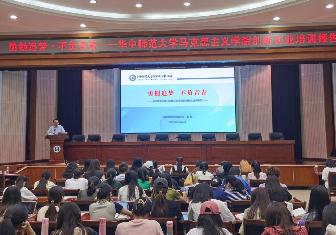 马克思主义学院讯(通讯员 雷绍佶;摄影 席雨欣)6月26日上午,研究力、创新力、引领力——马克思主义学院卓越技能训练周在科学会堂一楼报告厅举行。特邀华中师范大学科技园发展有限公司总经理、华中师范大学资产经营管理有限公司副总经理石炜担任“创新创业培训会专场”主讲嘉宾。本场讲座由马克思主义学院党委副书记邵莉莉主持。