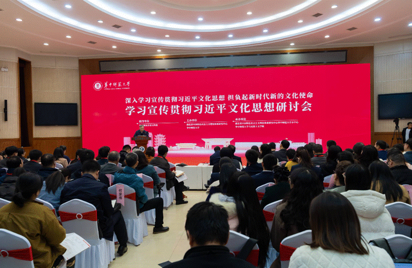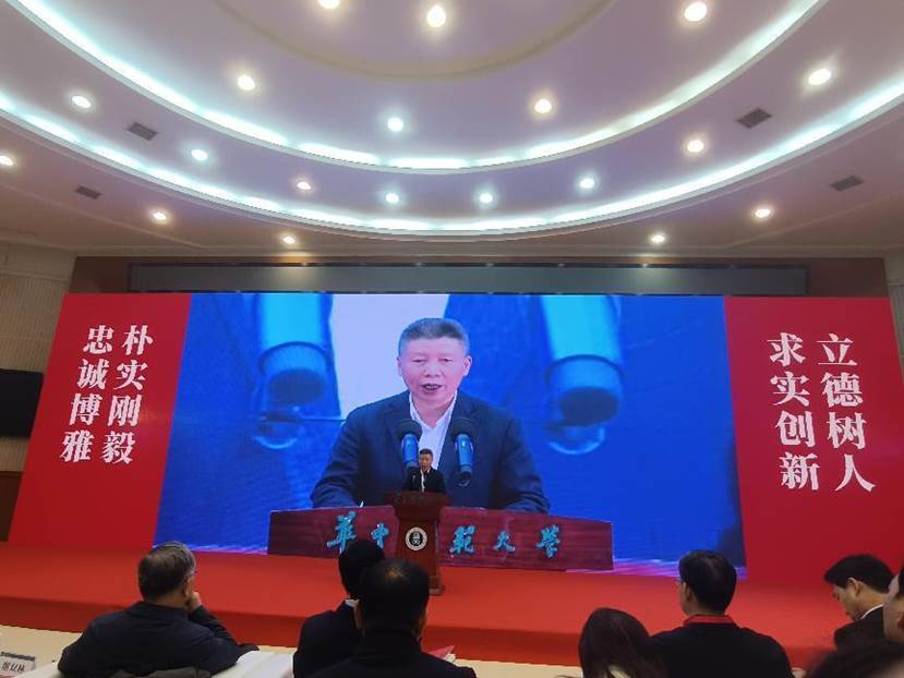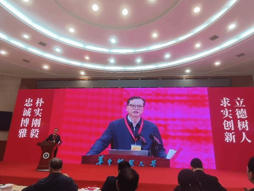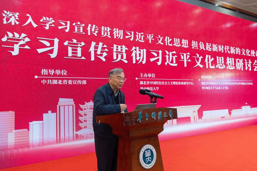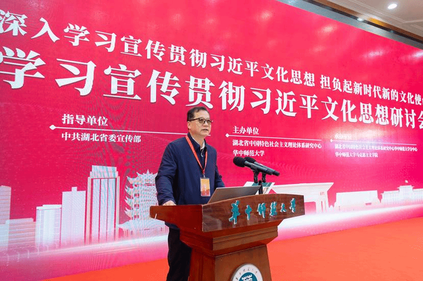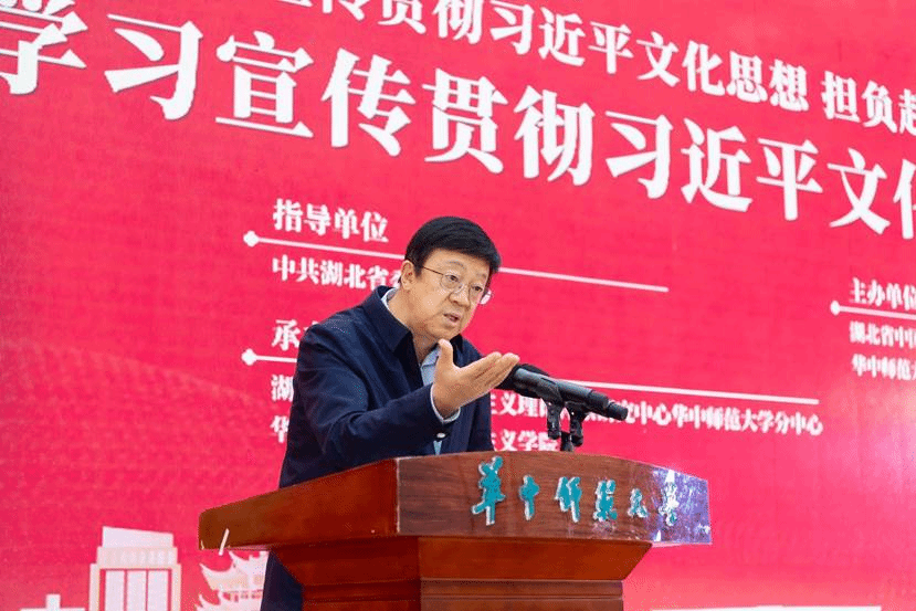 华中师范大学党委书记、湖北省中国特色社会主义理论体系研究中心华中师范大学分中心主任夏立新教授致辞。夏立新书记表达了对与会专家学者和师生代表的欢迎,回顾了120年来华中师范大学为文化强国建设所贡献的华师力量,介绍了华中师大深入学习领会贯彻习近平文化思想及湖北省中国特色社会主义理论体系研究中心华中师范大学分中心开展相关研究情况,希望与会人员能够集思广益,为深入学习领会贯彻习近平文化思想提供宝贵经验与贡献智慧。