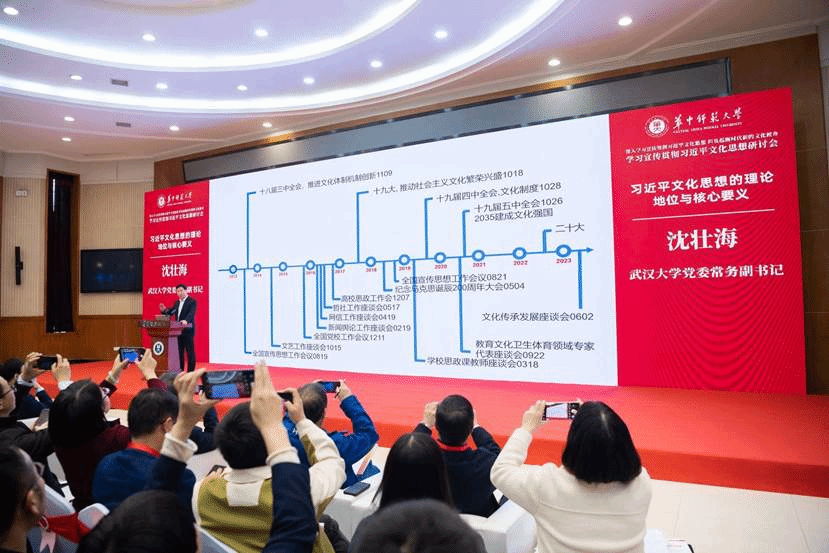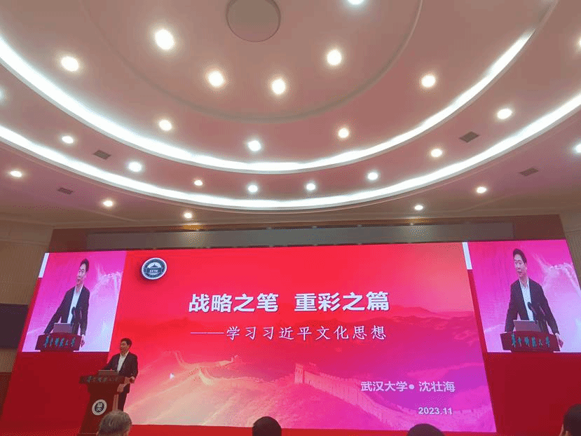 中央马克思主义理论研究和建设工程重点教材首席专家、武汉大学党委常务副书记、马克思主义学院院长沈壮海教授作主题为《习近平文化思想的理论地位与核心要义》的报告。报告指出,“如何认识提出习近平文化思想的重大意义、如何深刻把握习近平文化思想的理论地位”是我们学习习近平文化思想的两个重要问题,无论从我国发展进程、世界发展大势,还是新时代新征程,习近平文化思想都具有重大意义,并强调高校工作者在其中也要做出自己的贡献。