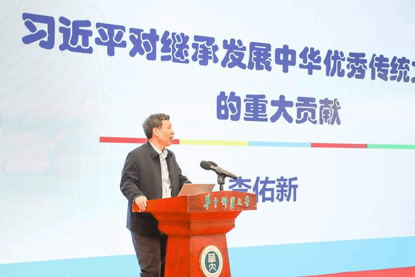 国务院学位委员会马克思主义理论、中共党史党建学学科评议组成员、湘潭大学毛泽东思想研究中心主任李佑新教授作《习近平对继承发展中华优秀传统文化的重大贡献》主题报告。他从“两个结合”的角度,归纳习近平对继承发展中华优秀传统文化五个方面的重大贡献,包括与时俱进地阐明了对待中华优秀传统文化的原则、高度评价优秀传统文化特别是提出和论述了文化自信等方面。