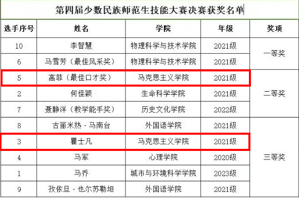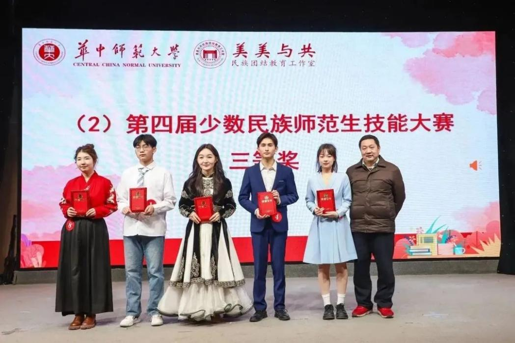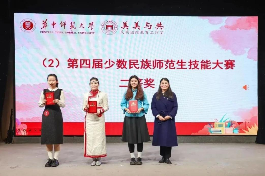 马克思主义学院讯(通讯员 潘依依)2023年12月10日,由华中师范大学党委学生工作部主办,学工部民族团结教育办公室、校美美与共民族团结教育工作室承办的“缤纷生涯我出彩,携手并肩划未来”第四届少数民族师范生技能大赛(决赛)暨第五届少数民族学生生涯导航月闭幕式在九号楼演播厅顺利举行。 经各学院推荐,来自11个学院、涵盖9个民族的21名师范生参加初赛现场讲课环节,其中10名选手成功突围进入决赛。经激烈角逐,我院学子高菲、瞿士凡在第四届少数民族师范生技能大赛(决赛)中分别获得二等奖、三等奖的佳绩。