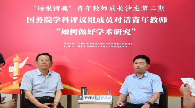 6月8日,马克思主义学院“培根铸魂”青年教师成长沙龙第二期暨国务院学位委员会学科评议组成员对话青年教师“如何做好学术研究”举行。对话嘉宾是来自北京师范大学中共党史党建研究院院长、华中师范大学特聘教授、国务院学科评议组成员王炳林教授。