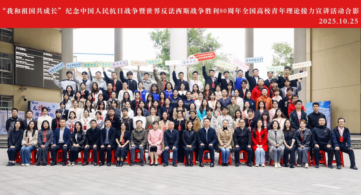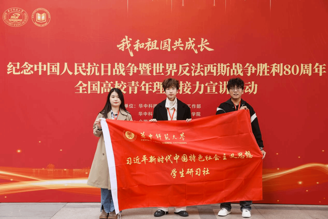 马克思主义学院讯(通讯员 王丹冬 白晨阳 杨坤颐;摄影 华中科技大学研究生红色理论学讲团)10月25日,由华中科技大学党委学生工作部、华中科技大学马克思主义学院主办,华中科技大学研究生红色理论学讲团承办的“我和祖国共成长”纪念中国人民抗日战争暨世界反法西斯战争胜利80周年全国高校青年理论接力宣讲活动在华中科技大学举行。湖北省教育厅思政处处长张彦昌、华中科技大学党委副书记张耀出席本次活动。华中师范大学习近平新时代中国特色社会主义思想学生研习社(以下简称“研习社”)成员白晨阳、杨坤颐、王丹冬参加本次活动,同来自全国20余所高校宣讲团的青年讲师共话青年使命担当。