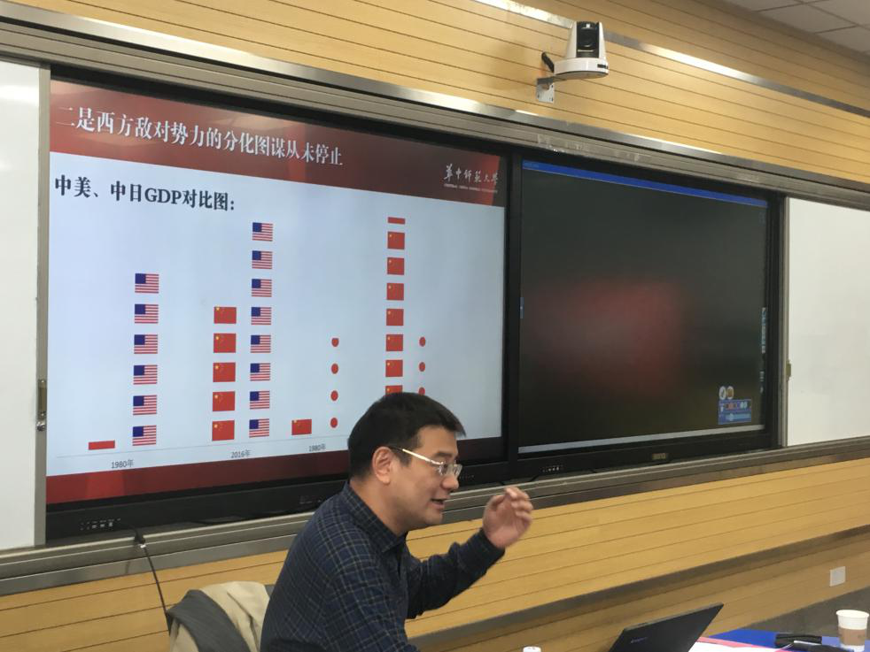 “一带一路、杭州G20峰会、亚投行、金砖会议、外汇储备、钢铁产量、电子类产量、中国天眼、天宫二号、探索一号、神舟飞船、辽宁号航母、四代重歼、穿浪导弹舰、巨浪导弹”,骆书记开篇就用翔实的案例和生动的图片向大家展示出一个经济社会发展成就辉煌、国际影响力显著提升、科学研究进步突飞猛进、国防建设成果令人振奋的中国,同学们的注意力迅速集中到骆书记的讲授中来。骆书记对辉煌中国的解读,其目的之一在于让在座的各位大学生感受到自己正身处一个伟大的时代,在这个时代中,当代大学生可以通过接受良好的高等教育来提升自身能力,不断实现自身价值、成就未来梦想。