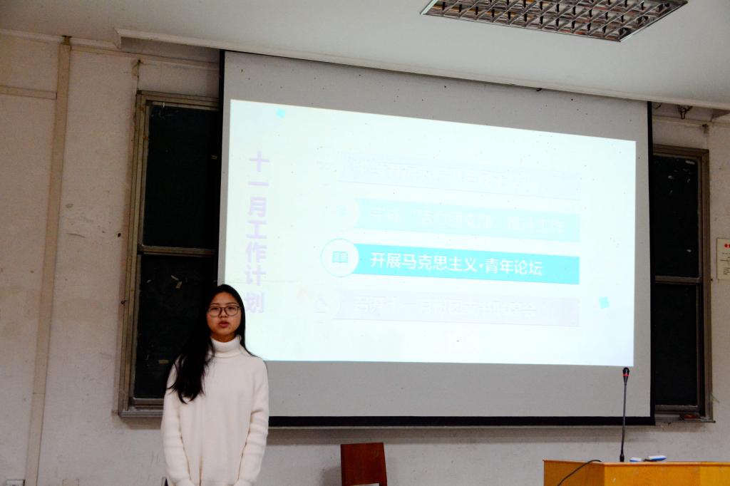 组织部副部长杨韵韵在工作汇报中总结了组织部举办的十月团支书联席会议、五院联合团干培训、优秀团日活动与优秀团支书推选以及学习十九大的活动。她还汇报了十一月工作计划,她认为11月15日活力团支部的推选和我院精品活动马克思主义·青年论坛是其未来工作重心,并希望能够班团联动以更好地建设优秀团委。文体中心部委陈文婧在工作汇报中表示文体中心在十月份主要工作为迎新晚会的举办和积极筹备运动会。“文体中心是一个很魔性的部门”,她具体汇报了上周的工作。副主席叶温丹在点评文体中心的工作时对团学联其他部门的帮助表示感谢,并表示在重大活动中感受到了集体的凝聚力。郭海源在点评时希望文体中心能够在以后的工作中能够举办丰富学生课余生活的优秀文艺活动和体育活动。副主席余逸飞也提出了要对各个球队进行训练,提高球队队员的配合。