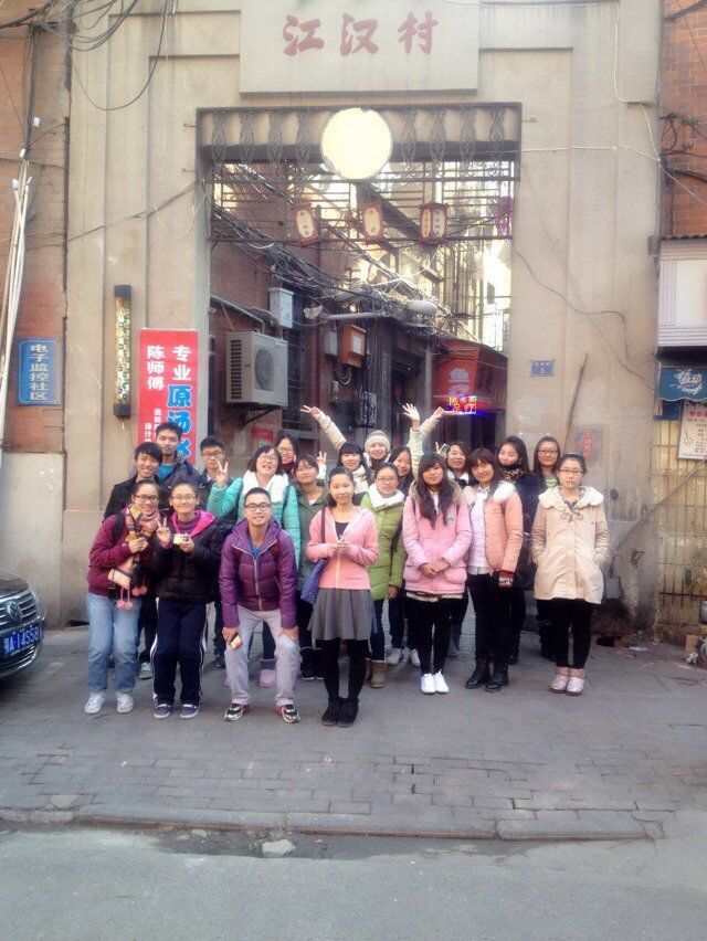 走出地铁口,同学们先进入了一条商业街。与一般的商业街不同的是,汉口的建筑充满异域风情,处处可见老洋行旧址。沿路往里走便是上海路,同学们看到了高大的天主教堂。一路走下去还有古老的红砖房,汉口花旗银行等。同学们在行进中一边拍照一边互相讨论回味着历史。大家在江汉村门口大家合了影。这里古老的居民楼小巷子和宏伟的异域建筑交替分布,形成微妙的的文化氛围,杨晓薇说:“在这里我看到了文化冲突,新旧文化、中外文化。他们风采各异,背后有着丰富的故事,我仿佛看到了历史在我眼前放映。”