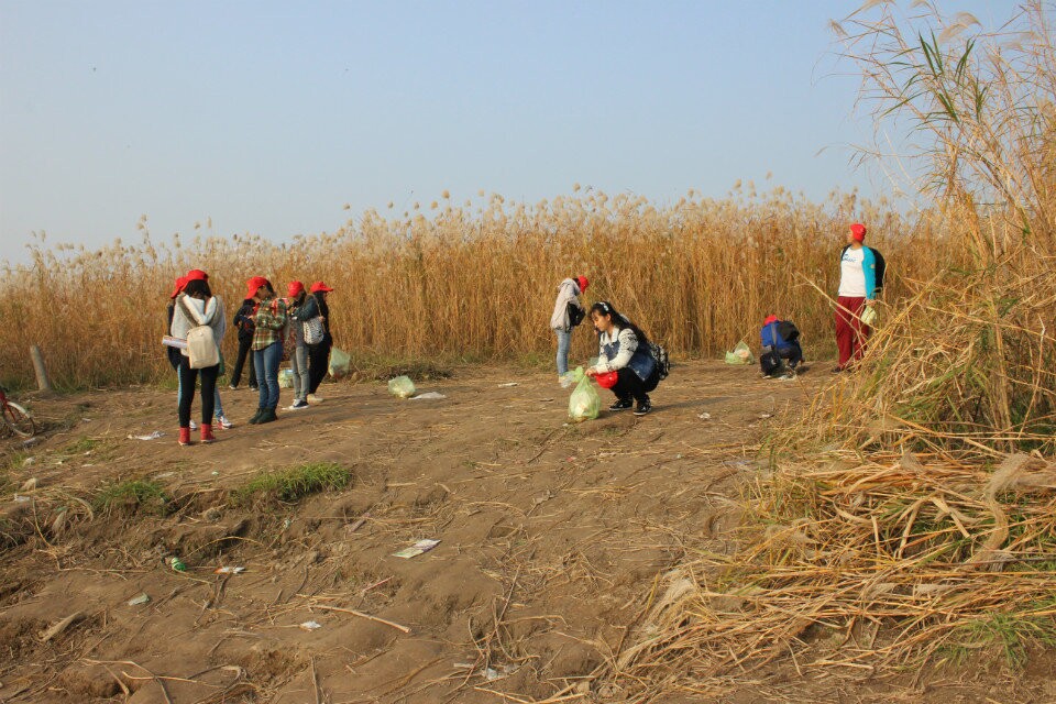 经过了长达一个小时的车程后,同学们来到汉口江滩,开始了捡垃圾工作。志愿者们头戴小红帽,手拿塑料袋,引起了许多在江滩晨练的人的注意。相比宽敞干净的水泥路,芦苇丛中的垃圾更为隐蔽,志愿者们的“捡爱”范围便在芦苇丛中。走进芦苇荡的深处,垃圾越多,而垃圾多数是一些塑料的包装。志愿者们在活动中互相帮助,分工合作,不嫌脏,不怕累,仔细地搜索着垃圾。刘嘉旺和宁志垚在捡垃圾时甚至踏入泥潭,弄脏了自己的鞋。志愿者们在偌大的江滩上走走停停,时不时的弯下腰捡垃圾,一直工作到了中午才返回学校。