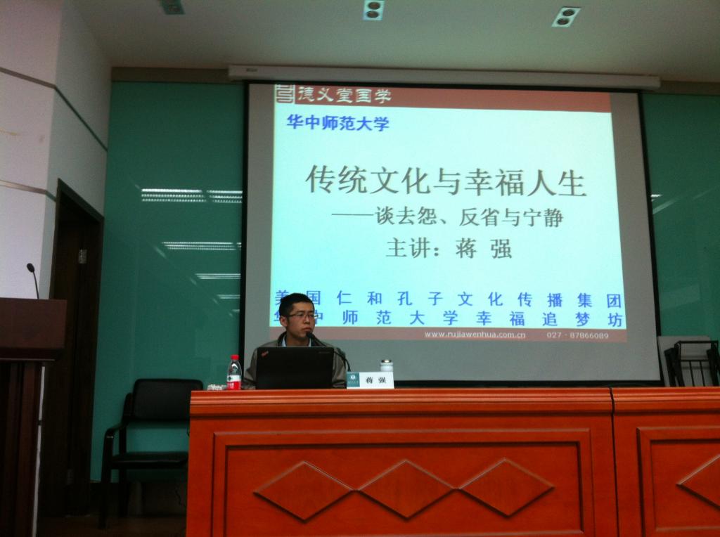 马克思主义学院讯(记者 张敏 通讯员 张羽璿)11月14日晚,第十九期百年求索·杰青讲坛在研究生院举行。这次讲坛邀请到美国仁和孔子传播集团亚太区副总裁、华中农大特聘副教授蒋强为大家作了一场题为《传统文化与幸福人生》的讲座,讲座吸引了来自校内外师生的参加。讲座由华中师范大学研究生会主办,马克思主义学院研究生会学术部、幸福追梦坊、教育学院研会学术部共同承办。