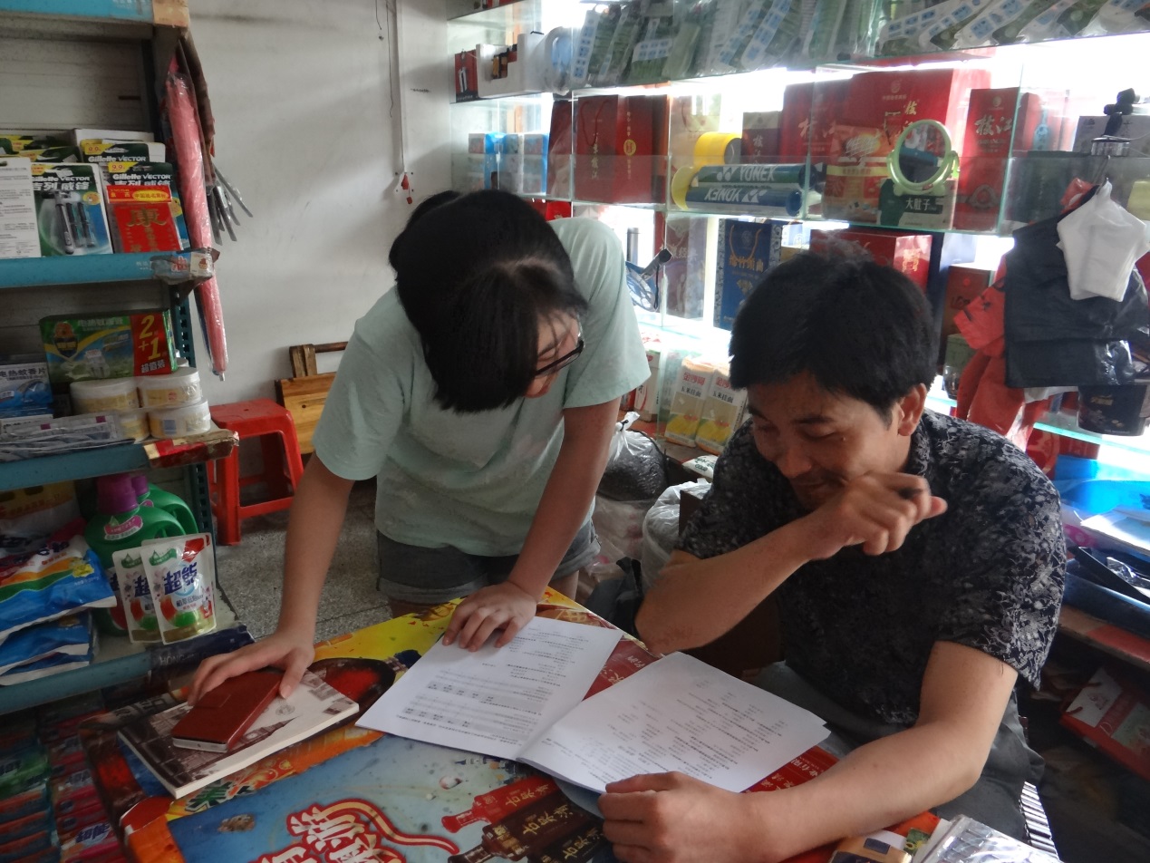 一份问卷长达七页约一百余道题,平均需要一个半小时完成。在全天的社会调研中,队员们共回收有效调查问卷四十二份,受访对象从普通群众到中共党员、从年轻妈妈到古稀老人、从种田农民到下岗工人。
