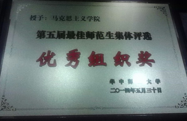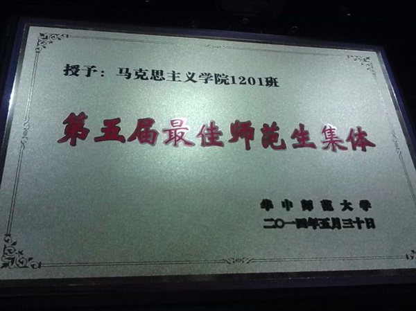 2014年,未来教育家联盟第五届“师范生最佳集体”评选,马克思主义学院获优秀组织奖,1201班获“最佳师范生集体”称号
