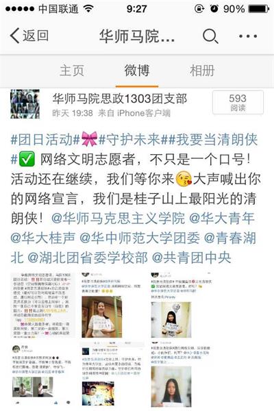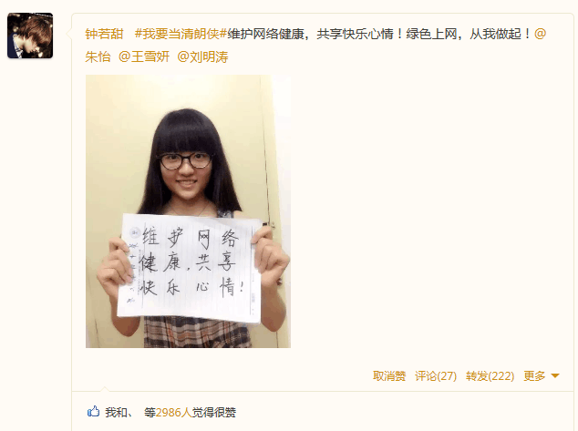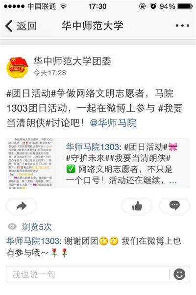 此次活动响应了“我要当清朗侠”的号召,活动形式以线上展示为主,要求同学以“我要当清朗侠”为话题,每人选择在微博、空间或微信平台上发一张自己手持网络文明宣言的照片,点赞人数前六名的可获得相应奖品。