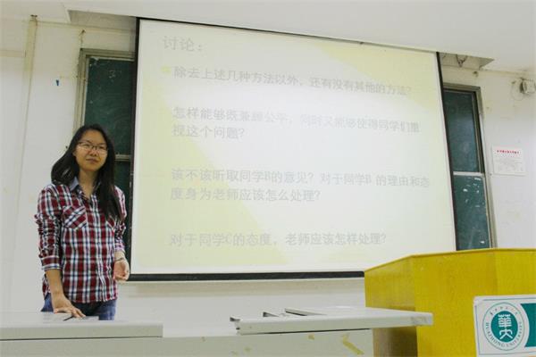 “喜乐课”的这种形式源于求真社的点子。主持人孙馨介绍说:“这个活动是借鉴喜乐街的模式,把情景设在课堂上,模拟高中课堂上可能发生的状况,锻炼师范生的临场应变能力。这次活动讲求欢乐和适度相统一的原则,让大家通过模拟课堂,从中发现问题,并讨论解决问题。”