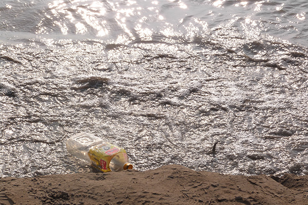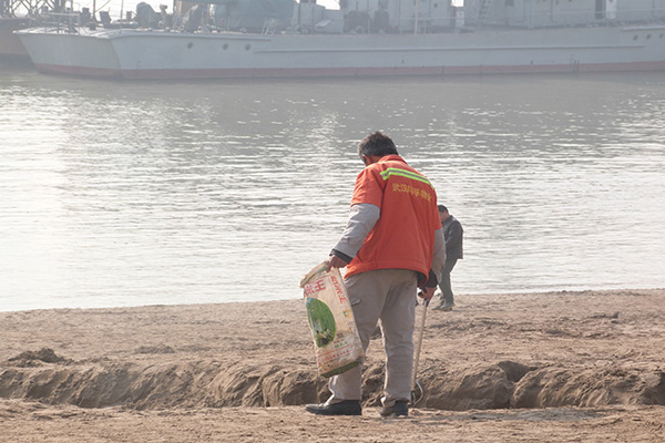 志愿者们分成5组,在分发工具后分散到了江滩各处开始工作。江滩上的垃圾以生活垃圾为主,有饮料瓶、塑料袋、果核、烟头等。这些垃圾有的被随意丢弃在江滩上,有的被掩埋在沙子中,增加了志愿者的捡拾难度。更有些垃圾由于无人捡拾,随潮涨潮落进入江水,污染了长江的环境。志愿者就在江边发现一个塑料瓶,由于捡拾困难不得不放弃。活动过程中有一位经过的市民,询问了志愿者们的身份。在得知志愿者们来自华中师范大学后,对志愿者们的行为提出了赞许。