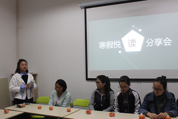 活动开始,主持人王婧以古今中外文化名人的名言,如黄庭坚的“三日不读书,便语言无味,面目可憎”、高尔基的“读书是求知者的面包”,引出此次活动主题——“悦”读分享。在刚刚结束的寒假里,马院学生不忘阅读,收获了许多阅读体会。寒假读书排名靠前的1601班刘雪宁、1501班徐佳秀作为学生代表,分享了她们的读书体会。