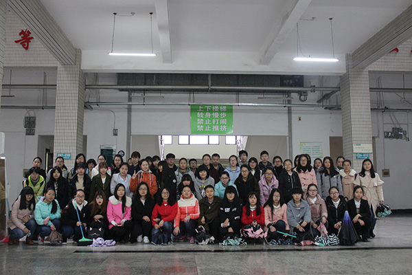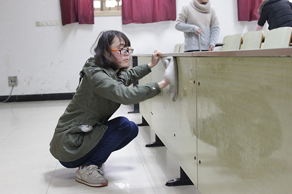 活动开始前,宋静给每个班级分布任务之后,同学们即各自开始了自己的打扫工作。在活动过程中,1604班吴迪将本班同学分成两部分,分别对一号楼需要打扫的两间教室进行清洁工作。玻璃的擦洗工作,由于难度较大、危险系数较高,由男生来完成,而拖地、擦洗室内设施则由女生来进行。整个活动分工明确,过程井然有序。