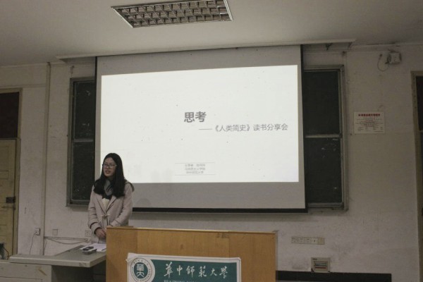 12:20,活动正式开始。第一位上场分享的陈玮玮给大家讲述了她读《人类简史》这本书的心得。她首先简介了这本书的内容:“本书讲述了人类的发展史,作者将人类发展史大致划为认知革命、农业革命和科技革命”,接着对书中它所感兴趣的观点进行剖析。比如在讲“农业革命的骗局”这个观点时,她举例说到:“不是人类驯服了小麦而是小麦驯化了人类”。谈到对于全书的感悟时,她总结说:“人类拥有神的能力,但是不负责任、贪得无厌,这是十分危险的。”