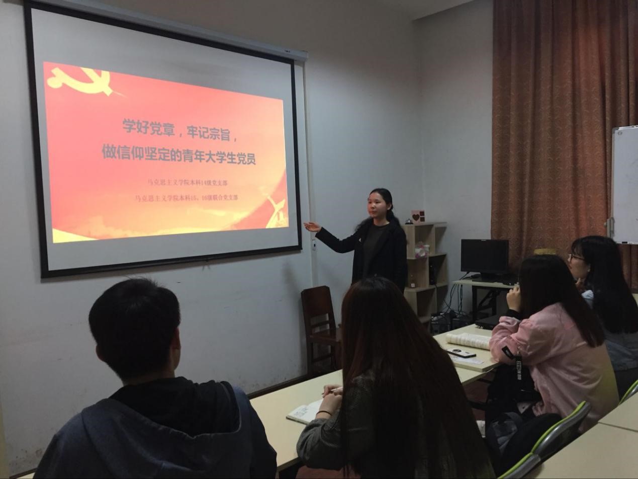 马克思主义学院讯(通讯员 张志恒)为深入开展学生党员“两学一做”学习教育活动,马院本科生党支部支委会于4月7日在马院活动室开展了“学好党章,牢记宗旨,做信仰坚定的青年大学生党员”的主题教育活动,本次活动由14级党支部书记张婉莹主持。