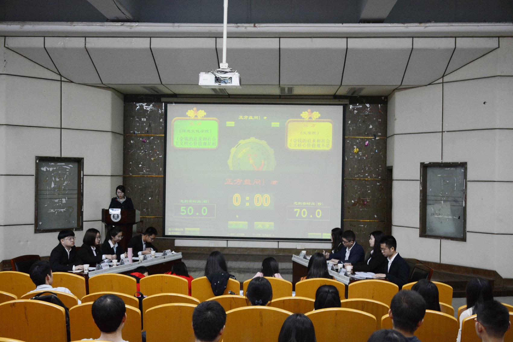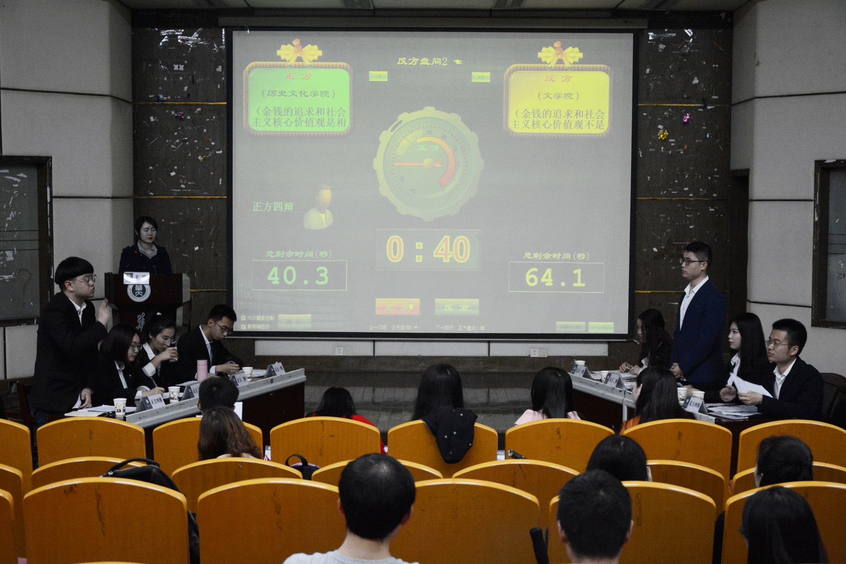 其中,在下午五时许,来自历史文化学院与文学院的两支队伍就“金钱的追求和践行社会主义核心价值观是否相背离”展开了激烈而精彩的辩论。在本场辩论中,历史文化学院持正方立场,其四位辩手分别由武超、姜可塑、张旭和刘博涛四位同学担任。文学院持反方立场,四位辩手分别是李文丽、丁萌、徐梦真、陈逸鸣同学。