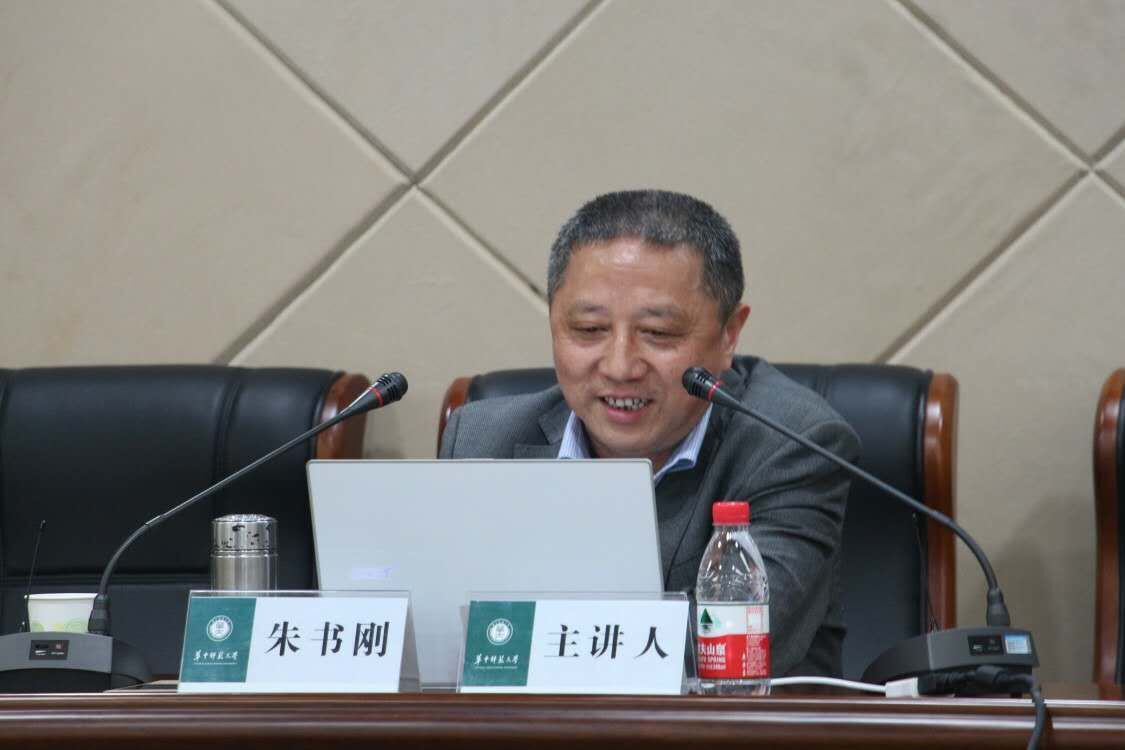 讲座开始之前,主持人对朱教授作了介绍:朱书刚,现为中南财经政法大学马克思主义学院教授、台湾研究所所长。此外,他还担任武汉大学台湾研究所学术委员会委员,兼任湖北省政协常委、湖北省政协文史和学习委员会委员、湖北者法官检察官遴选委员会专家委员等职务。朱书刚教授主要从事哲学、政治学理论与应用研究,独著或参著(含主编或参编)著作20余部,已发表论文80多篇。学术专著《邓小平经济哲学思想》获湖北省人民政府授予的第四届社会科学优秀成果三等奖,学术论文“统筹人与自然和谐发展,打造‘生态湖北’”获中国政策科学研究会授予“科学发展观理论与实践”征文一等奖。简单的介绍后,朱书刚教授便开始了他的讲演。朱教授深刻讲述了台湾的重要战略地位、地理环境、人文历史、台湾问题的起源以及1949年以后海峡两岸关系的演变情况,提出了解决台湾问题的良策,并认为两岸关系仍展现曙光。与此同时,他认为我们仍应重视台湾问题得到圆满解决前所面临的新挑战,警惕海峡两岸关系发展的新变局。讲座的最后,朱教授表达了他对早日收复台湾、完成祖国统一大业的殷切盼望,他说:“台湾自古以来就是中国领土不可分割的一部分,海峡两岸同胞血同缘、书同文、语同声,都是炎黄子孙,同属中华民族大家庭,全体中华儿女携手努力,就一定能在同心实现中华民族伟大复兴的历史进程中完成祖国统一大业!”朱教授的这番话,引发了在座老师、学生们的深思。