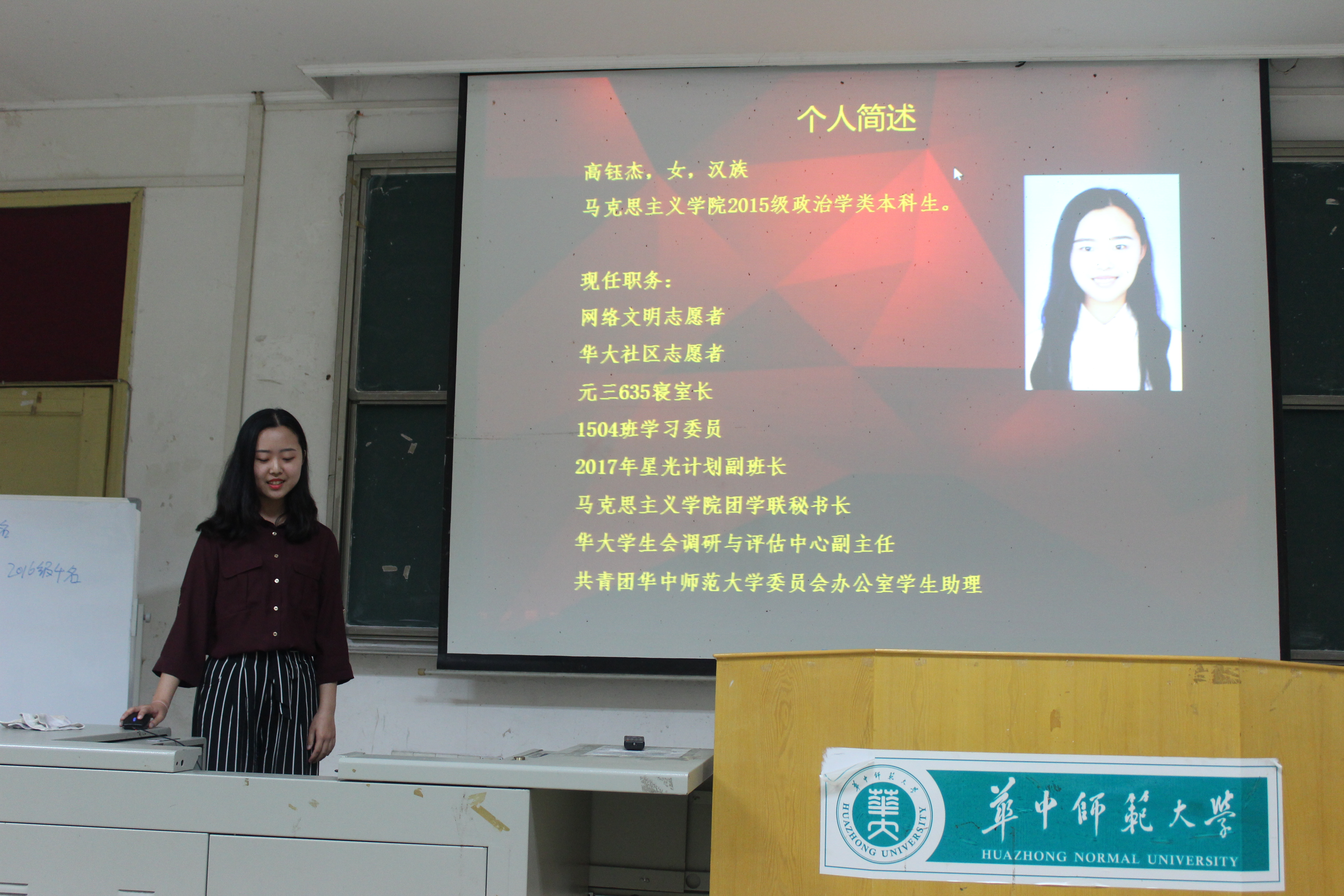 本次活动还有有两位特殊的答辩者——2015级的李瑞和朱阿妹,她们由于去台湾交换学习,无法来到活动的现场。她们的好友代替她们播放了她们的视频,给大家介绍了她们的基本情况。