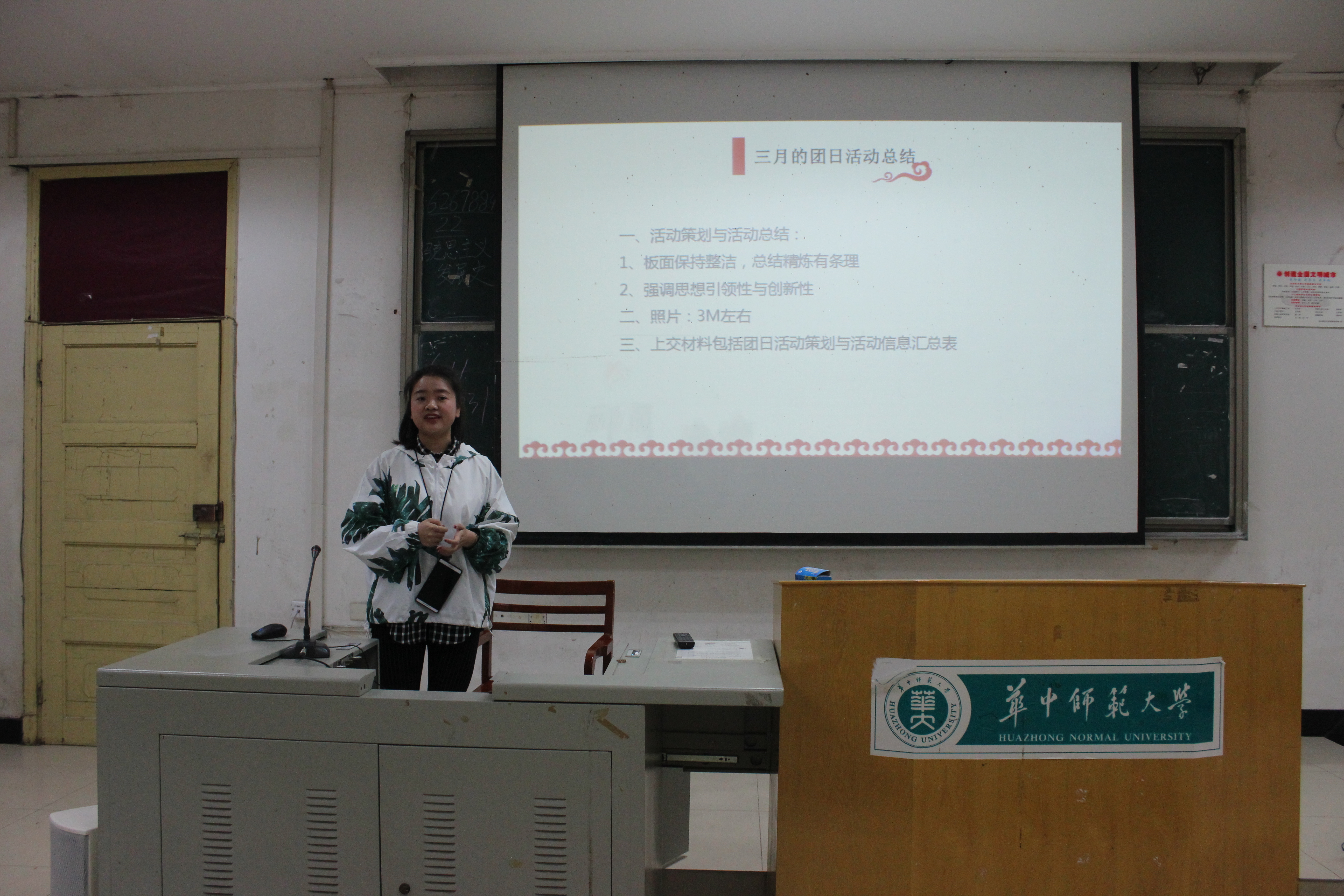 会议第二部分以总结三月团日活动开展情况和传达四月份团日活动建议主题为主要内容。刘雪宁就三月份团日活动材料存在的问题:撰写活动策划、总结条理不清、格式不当等展开,表示相关基层团干应摆正态度,以更加严谨、端正的态度学习并撰写团日活动材料,以此来完成对团日活动的提升总结,真正将团日活动效果提升到最高层次。另外,她提出了了团支书应保证宣传稿的时效性,加大宣传力度的建议。接着,她向各团支书传达了四月份的团日活动的建议主题,并强调团日活动信息表的上交状况会纳入考评范围。