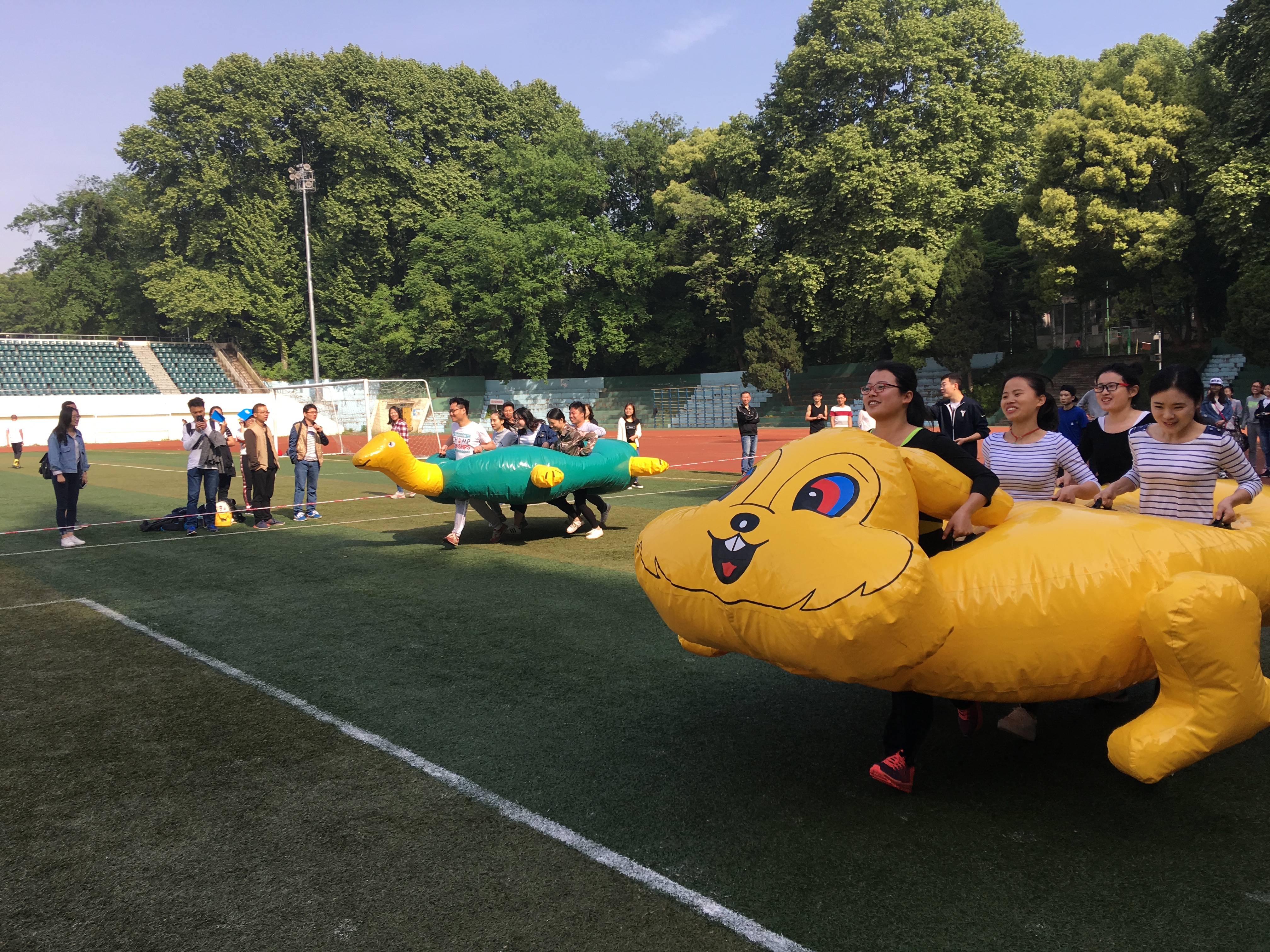本次趣味运动会由“4+1+1”游戏环节组成。包括龟兔赛跑、穿越电网、众星捧月、疯狂指压板、协力拔河和终极擂台赛。活动采取团体积分制,所有活动积分相加,决出前八名。来自各个学院的参赛选手们斗志昂扬、信心满满,全力以赴地进行每一场比赛。没有参加比赛的同学们也在旁边呐喊助威。整个佑铭体育场人潮涌动,好不热闹。其中,最吸引人眼球的莫过于“龟兔赛跑”的比赛了。每支队伍选出五名选手套进一只巨大的充气模型,并且要拉着充气模型在30米跑道上全力奔跑。跑道在10米,25米处放置椅子,选手们要以绕“8”字形式绕过椅子;20米处还设拦线作为障碍物,选手们要拉着充气模型从1.5米高的拦线下钻过去。哨声一响,比赛现场就沸腾了。只见选手们身手矫健地穿过一个个障碍,在跑道上狂奔。“乌龟”和“兔子”赛得分外激烈,场边观众的呐喊声也分外热烈。最受欢迎的要属“疯狂指压板”了。每队上场八人,待哨声一响开始计时,参赛队伍要依次完成指压板上四个环节的游戏接力:跳大绳、背人、“独脚小火车”和摆字。“疯狂指压板”特别考验同学们的忍耐力和协作能力。在指压板上进行完比赛,许多同学都大呼“太痛了”。“穿越电网”也是一项非常考验同学们协作能力的比赛,因为只有发挥集体的智慧和力量才能顺利穿过“电网”。