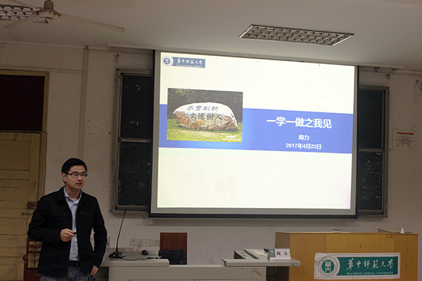 陶力把这次讲座的主题定为“一学一做之我见”。他的演讲主要围绕三个问题展开:什么是“一学一做”,为什么要“一学一做”和怎么展开“一学一做”。