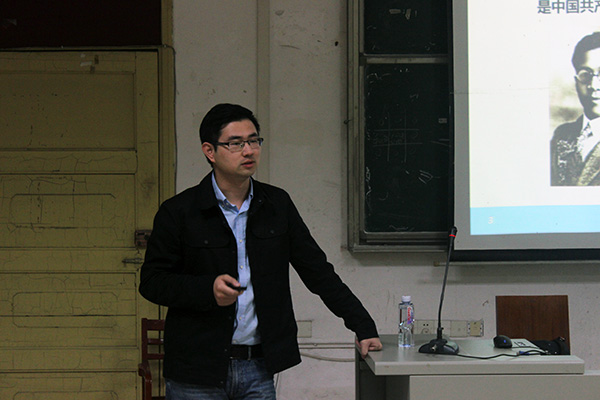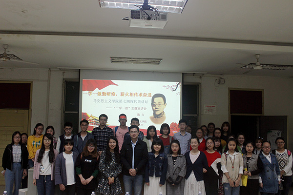 马克思主义学院讯(记者 张译文)4月22日晚,我院恽代英讲坛第七期在1101教室顺利举行。本次活动主讲人是校团委办公室主任陶力,他面向马院全体团学联成员和2014、2015、2016级各级班干以及2017年优秀团员、团干等就“一学一做”展开讲座。我院团委书记马梦琦担任主持人,团委副书记王轲玮作为嘉宾出席了本次活动。