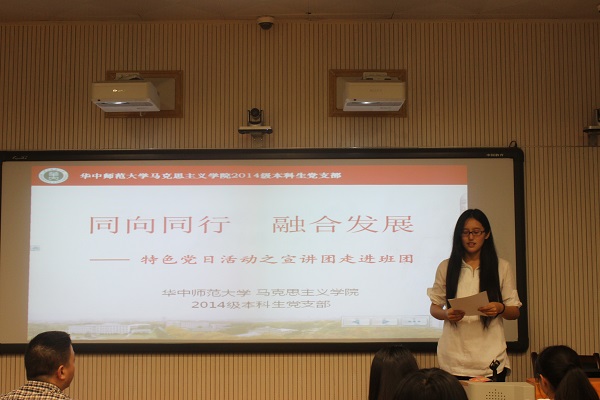 接下来,恽代英青年领袖培养班负责人、2014级党支部成员赵乙丹从党建带团建的角度出发进行了汇报分享。她在分享中首先表示,高校党建带团建工作是党建工作的重要组成部分,也是促进团的建设的一项工作重点,党建带团建的根本是“建”,关键是“带”,目标是发展。接着,她从“健全组织机构,形成共建合力;加强理论学习,打造学习共同体;以项目化推进合作,实现共建共赢;筑牢宣传阵地,强化思想引领”四个方面进一步说明了我院将整体推进党团建设作为出发点,充分发挥2014级本科生党支部和恽代英青年领袖培养班的优势,从思想建设、组织建设、作风建设等方面,协调做好“以学生党建带团建,以团建促学生党建,建构学生党建与团建深度互动的模式”的工作,取得了阶段性的成果。