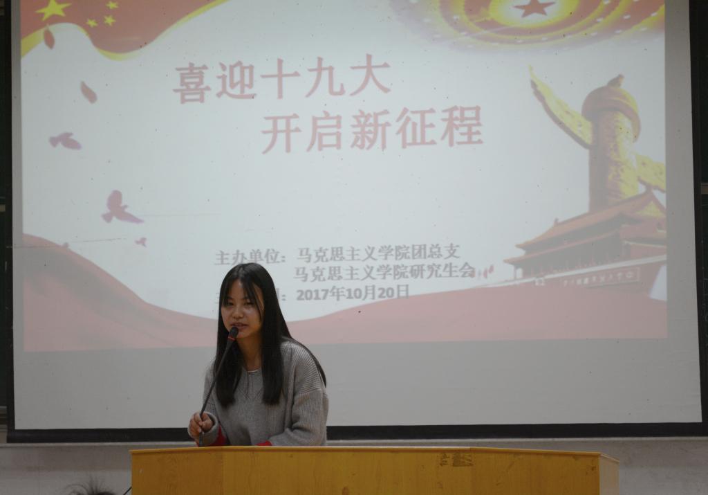马克思主义学院讯(记者 洪娟;摄影 夏丽莎)2017年10月20日上午十点三十分,马克思主义学院“喜迎十九大 开启新征程”主题学习交流会在一号楼1101教室举行。活动由马克思主义学院研究生会与团总支共同组织,团总支实践就业部朱月霞担任主持人,全院共150余名师生参加。