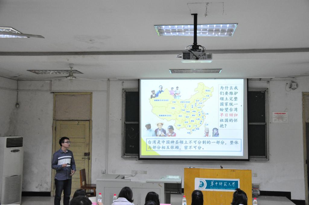 选手们准备充分、亮点频出。来自马克思主义学院思想政治教育专业的张家帮同学在《整体与部分的联系》教学中以“拼图有哲学”活动引入课堂,通过动手操作与问题探究的方式形象解释了整体与部分的关系,进而通过台湾与大陆关系的类比在进一步说明整体与部分相互依赖关系的同时渗透了爱国主义教育。在深入讲解整体与部分相互作用关系时通过联系个人梦与中国梦、区域发展与全面小康等时政将理论讲解与情感态度价值观教育融合,充分体现学科思想性。