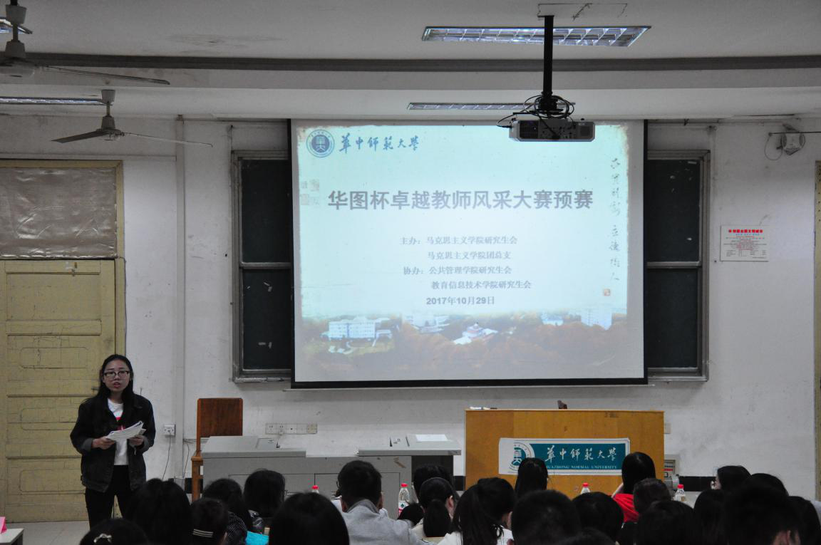 第三届“华图杯卓越教师风采大赛”由马克思主义学院研究生会与团总支主办,公共管理学院研究生会、教育与信息技术学院研究生会协办。10月29日上午8点30分,预赛在华中师范大学马克思主义学院一楼举行,由于报名人数较多,经初步筛选确定了50名选手进入预赛,选手抽签确定好顺序后平分为两组分别在我院1101和多功能教室单独进行比赛。此次教学技能比拼吸引了许多师范生包括非师范生前来观看学习,华图的老师也来到了现场。