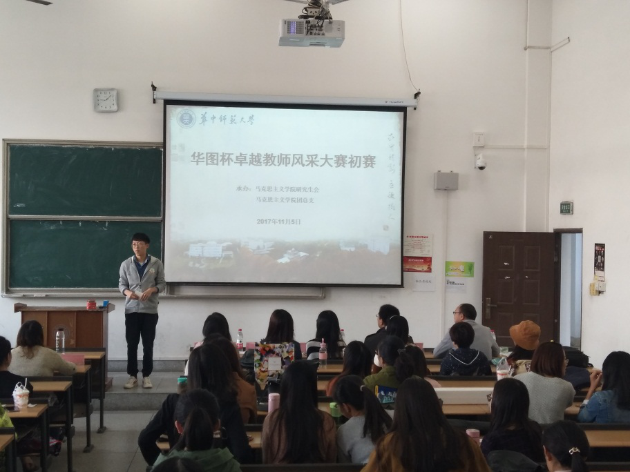 (通讯员 王荣;摄影 王荣)“给你三尺讲台,展你教师风采。”为丰富研究生生活,为研究生准教师提供一个学以致用的实践与交流平台,促进研究生的全面发展,11月5日上午9点整,第三届“华图杯”卓越教师风采大赛初赛在华中师范大学9号楼102教室成功举办。此次活动由华中师范大学马克思主义学院研究生会与马克思主义团总支以及华图教育湖北分校联合举办。