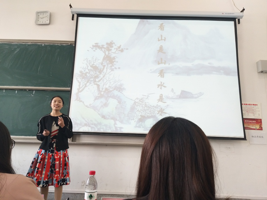 讲课环节开始之后,15位选手按抽签顺序依次上场。选手来自不同的学院,不同的专业,涉及讲课内容广泛。比赛过程中,他们从课本内容出发,巧妙结合实际,对知识点进行了分析,与台下观众互动强,现在气氛活跃。1号选手是来自马克思主义学院的罗胜兰,她选择的是高中政治《哲学的基本问题》这一框的内容,她从王国维的三重境界出发,分析“客观存在的山水不曾变化,思维认识不断变化”自然地引出了授课主题。让学生在学习哲学的过程不再枯燥,使哲学更加通俗易懂。2号选手是来自教育学院的王莉娟,她选择的是高中语文课本《故都的秋》这一节内容,她从郁达夫散文特点出发引入,从“怀念”、“欣赏”、“心境”三个角度进行了阐述,让观众深深感受到了郁达夫的情感世界。14号选手是来自物理学院的王翠,她所讲授的内容是《自由落体运动》。王翠先通过一个现场试验得出了一个物理结论,让同学们记忆深刻。最后她通过一段打油诗加深了学生对本堂课的学习。15位选手在各自讲授的过程中,无论从PPT的制作还是讲台的讲授,表现都各有千秋,非常出色。