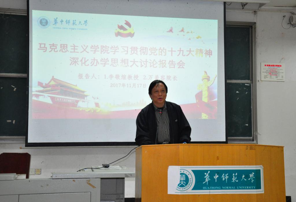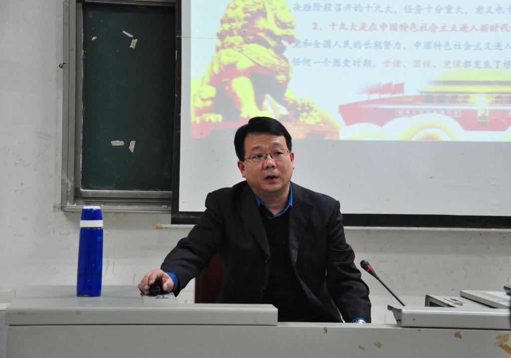 本次报告会由马克思主义学院书记钟选友主持。首先马克思主义学院李敬煊教授从党史角度以“党史视域下十九大之理论创新”这个主题进行了报告。李教授从十九大召开的时代背景、十九大召开前的筹备工作、十九大的理论创新、十九大的重大意义四个方面对十九大精神进行了深刻解读,他重点从“新时代、新思想、新判断、新征程、新方略、新部署”这个六个方面对十九大的理论创新之处加以阐述,赢得了现场教师和学生的热烈掌声。接下来马克思主义学院院长万美容教授主要从三个方面作了报告:其一,作为一个共产党人不能忘记共产党的初心和使命,要把不忘初心、牢记使命与特殊身份、承担任务以及现在所面临的形势结合起来思考,为中国特色社会主义事业培养合格的接班人服务;其二,他号召全员教职工团结一致,凝心聚力把马院建设好;其三,他强调要深化改革,抓住发展机遇把建设国内一流、特色鲜明的马克思主义学院作为深化办学思想大讨论的主题。