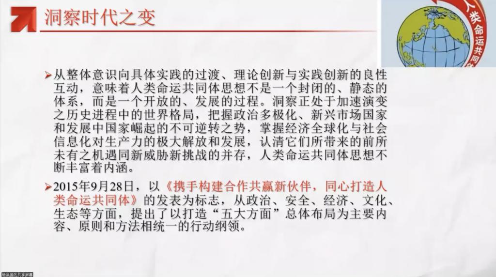在这里,杨洪源老师阐述了打造“五大方面”的总体布局,即平等相待、互商互谅的伙伴关系,是构建人类命运共同体的政治前提;公道正义、共建共享的安全格局,是构建人类命运共同体的基本保障;开放创新、包容互惠的发展前景,是构建人类命运共同体的经济基础;和而不同、兼收并蓄的文明交流,是构建人类命运共同体的文化纽带;崇尚自然、绿色发展的生态体系,是构建人类命运共同体的必要条件。