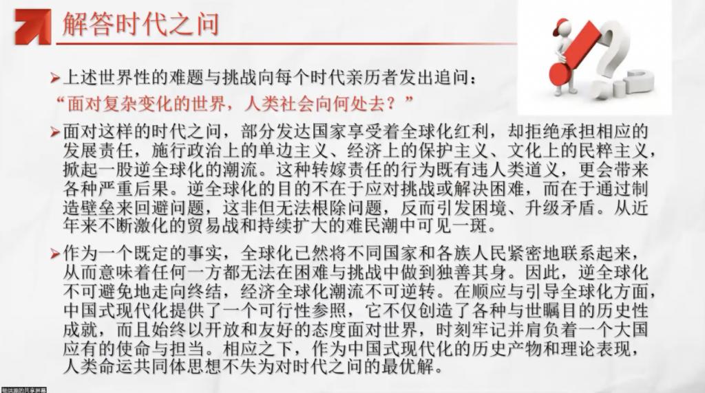 本次会议分为四个方面,层层递进地阐述了有关人类命运共同体这一思想的历史生成、演变趋势及其文明逻辑,深入浅出地向同学们展示了一个逻辑严密的演变过程。过程分为“解答时代之问”“洞察时代之变”“回应时代之需”和“引领时代之先”。