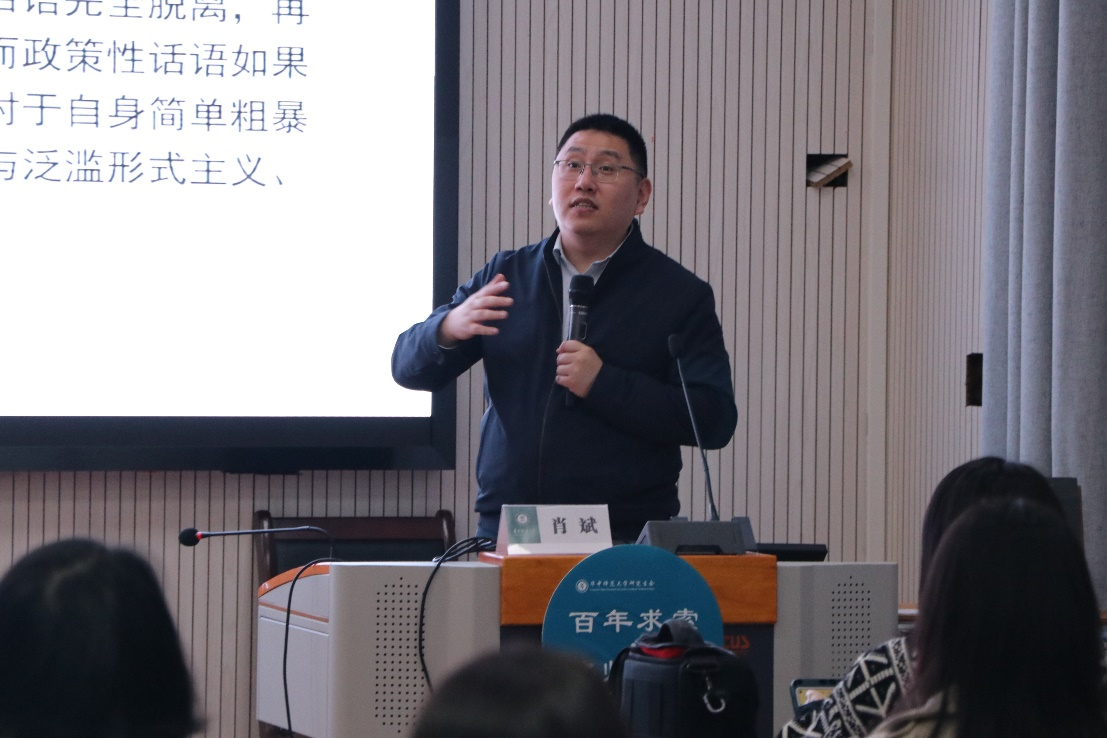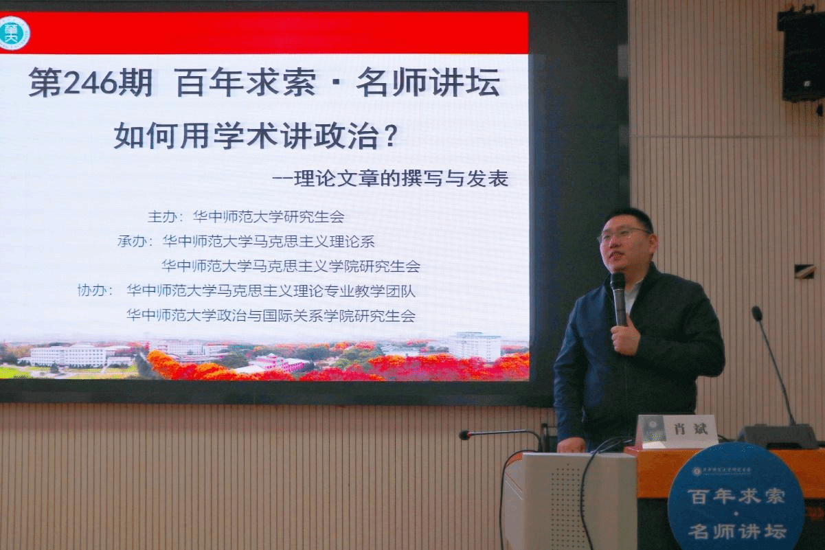 马克思主义学院讯(通讯员 杜芮;摄影 杜芮 王紫月)3月26日晚,由华中师范大学研究生会主办,华中师范大学马克思主义理论系、马克思主义学院研究生会承办的第246期“百年求索·名师讲坛”在马克思主义学院3楼学术报告厅顺利举行。本次讲坛特邀厦门大学马克思主义学院教授、博士生导师肖斌主讲《如何用学术讲政治?——理论宣传文章的撰写与发表》,讲坛由华中师范大学马克思主义学院马克思主义理论系主任孟飞主持,学校部分师生百余人听取讲坛,现场座无虚席。