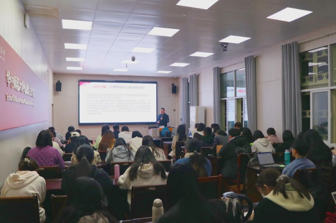 肖斌教授围绕“正确处理新时代下中国话语的三大关系”的主题,从“话语生成”、“话语表达”、“话语共振”三个方面展开论述。在“话语生成”方面,他首先阐明“话语生成”的定义,对人为割裂批判性话语与建设性话语有机联系的观点进行批判。接着,他举出目前所出现的一系列政治陷阱和伪命题,通过深刻分析,引导大家在纷繁复杂的事例中坚定立场、看清真相。在“话语表达”方面,他强调“阶级性话语”和“人类性话语”两部分内容。通过分析当今中国所处的特殊历史情境,指出两种话语兼则相得益彰,偏则各不得其所,并进一步论述如何使这两种话语在“组合配置”中实现最佳状态的问题。