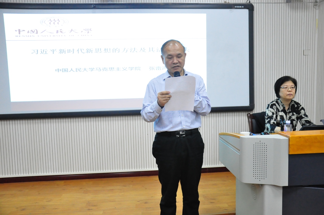 讲座伊始,张雷声教授以“学以致用”和“掌握、运用方法”为切入点,从“马克思主义哲学当做看家本领的方法”、“坚持实事求是的方法”、“坚持求真务实的方法”、“坚持系统分析、矛盾分析、历史分析和三个逻辑相统一的方法”四个方面分别阐述了习近平新时代新思想的方法。张雷声教授就坚持实事求是的方法做了深刻地分析,指出要通过从群众中来到群众中去的方法来实现实事求是,让广大群众真正地掌握理论,从而来改造世界。在剖析了方法之后,张雷声教授阐述了习近平新时代新思想方法的活水源头,以《资本论》为例介绍了研究方法的源头,唯物辩证法、引证法、数量法等方法是学术研究必备的方法。张雷声教授结合现实案例归纳了马克思主义理论研究方法的系统构成,指出只有用系统的研究方法才能更好地理解马克思主义。
