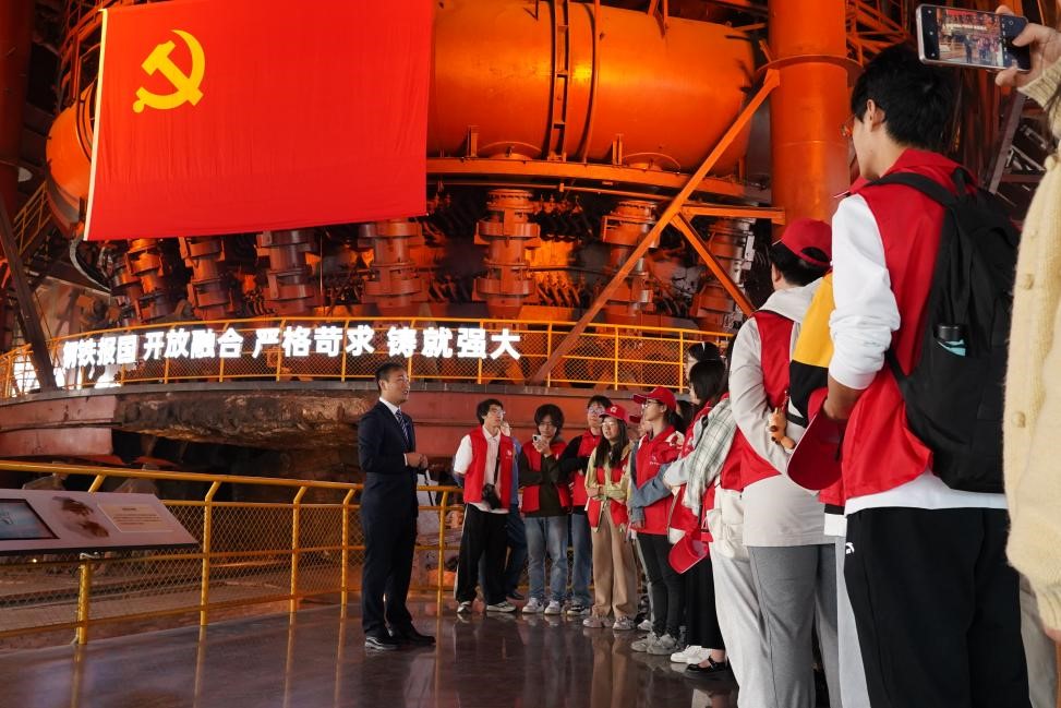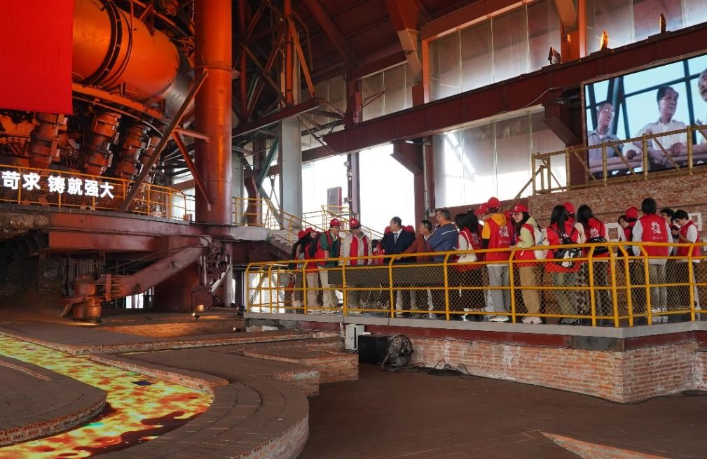 在武钢一号高炉纪念馆二楼,讲解员程琳带领师生参观了高高矗立的一号高炉炉体,观看1958年9月13日毛主席亲临现场见证第一炉铁水出炉纪录片并体验了模拟铁水出炉的震撼瞬间。来到一号高炉背后,平台的6根长方体立柱上,“钢铁是绿色的吗?”“我们的城市还需要钢铁厂吗?”“钢铁厂的未来会是怎么样?”等六大问题引发师生关于高质量发展的思考和讨论。在讲解员的介绍下,师生近距离感受了武钢在绿色发展等方面的成功转型,切身了解到高质量发展在钢铁工业领域的生动体现。