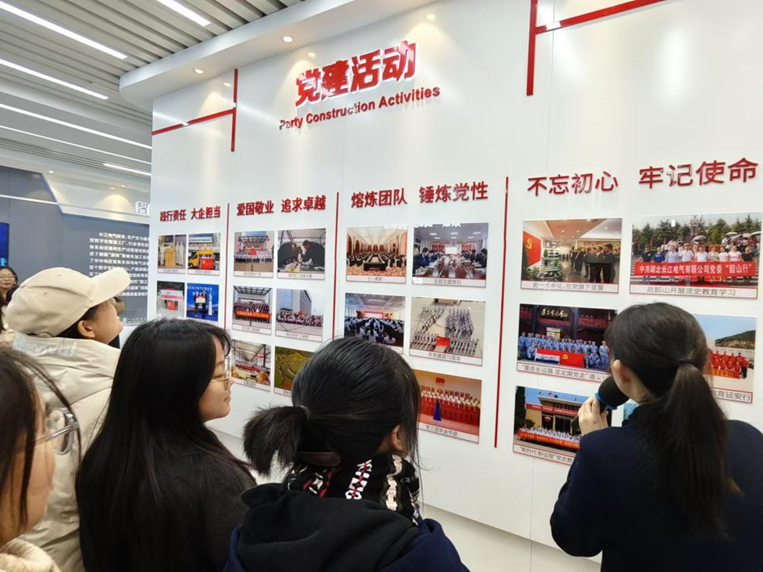 在公司文化长廊,公司员工向学院师生分享了“党建引领”赋能公司发展的经验,并向同学们介绍了公司所获得的各项荣誉,以及公司对开拓世界市场所进行的努力和产生的巨大成果。