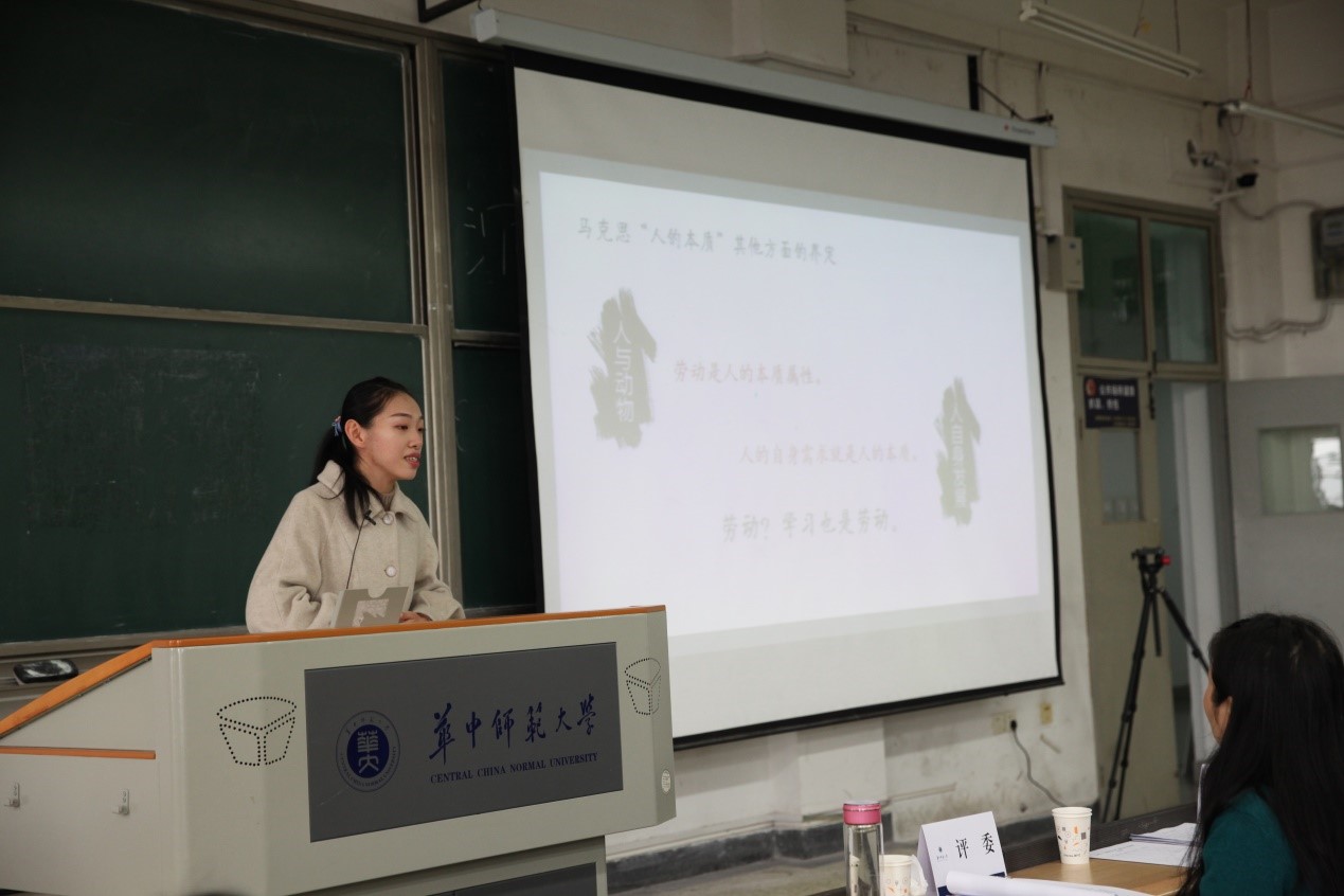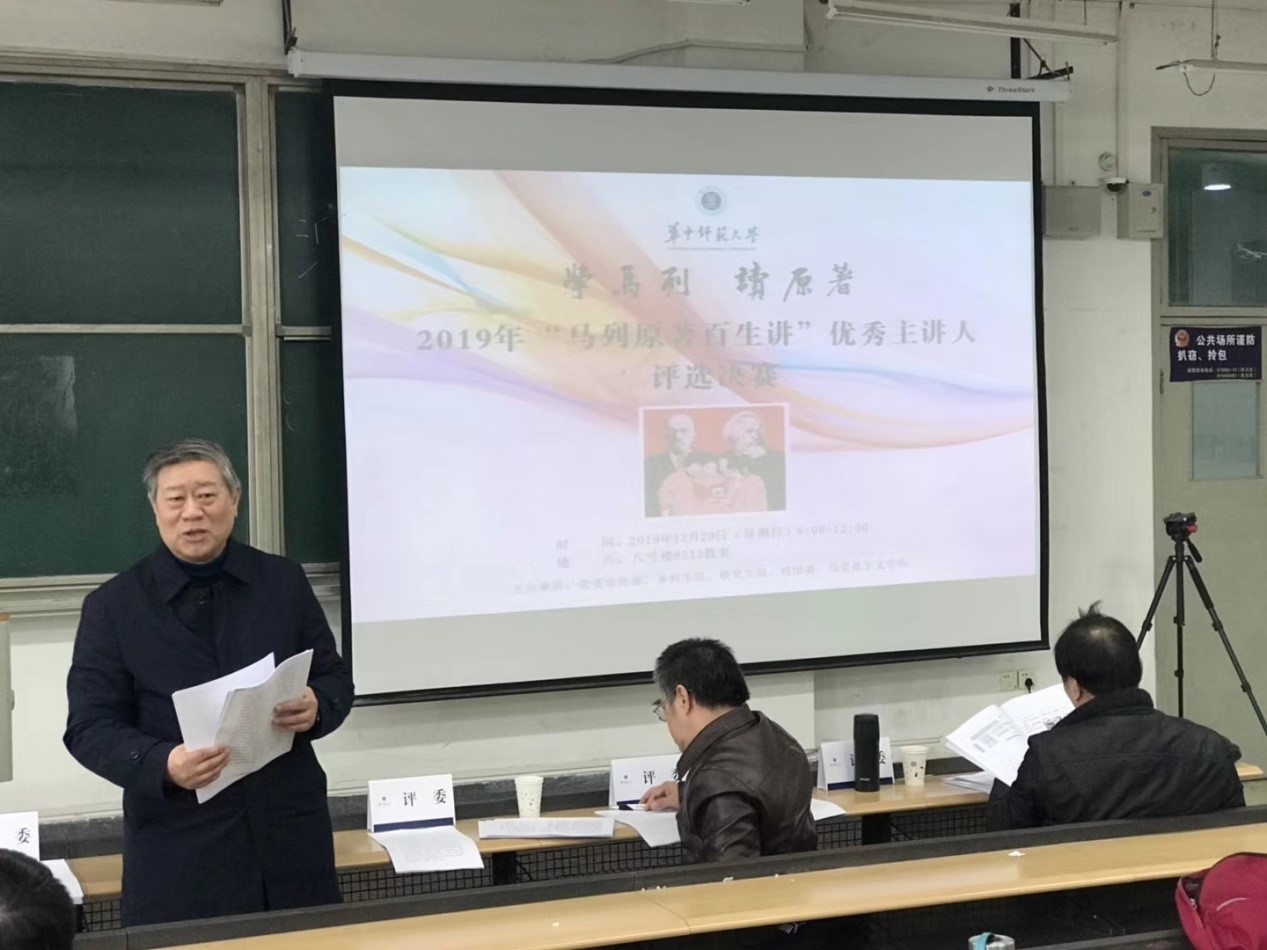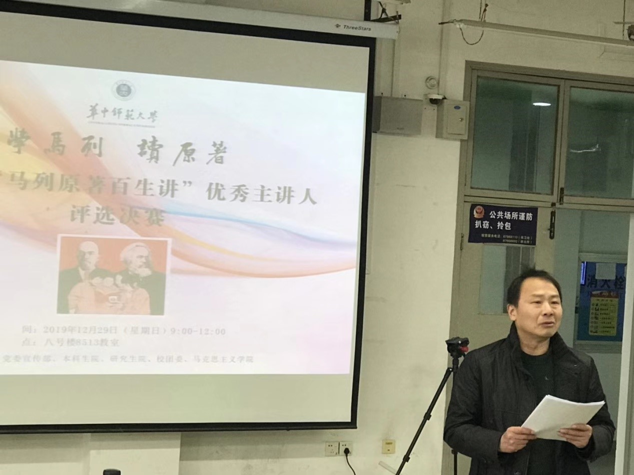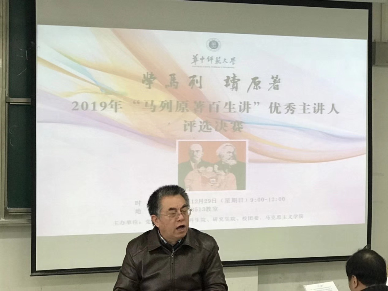 马克思主义学院讯(通讯员 王丹竹)2019年12月29日上午9:00,华中师范大学马克思主义学院举办的“马列原著百生讲”优秀主讲人评选决赛在八号楼8510教室成功举办。本次比赛要求选取马列原著中的某一句、某一段、某一篇为切入点,深入剖析体会经典中的深刻内涵,结合自身学习体会和生活经历展开演讲。武汉大学夏建国教授、武汉理工大学夏劲教授、华中师范大学叶泽雄教授、华中师范大学李芳教授作为本次比赛的评委老师,和同学们一起,欣赏了本次选手们的精彩表现。