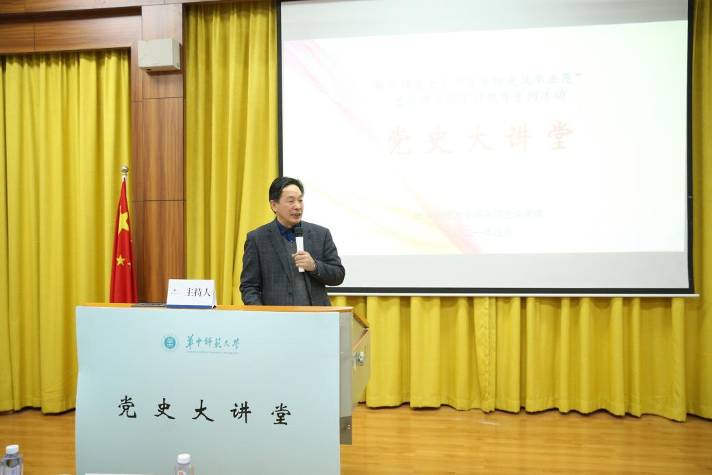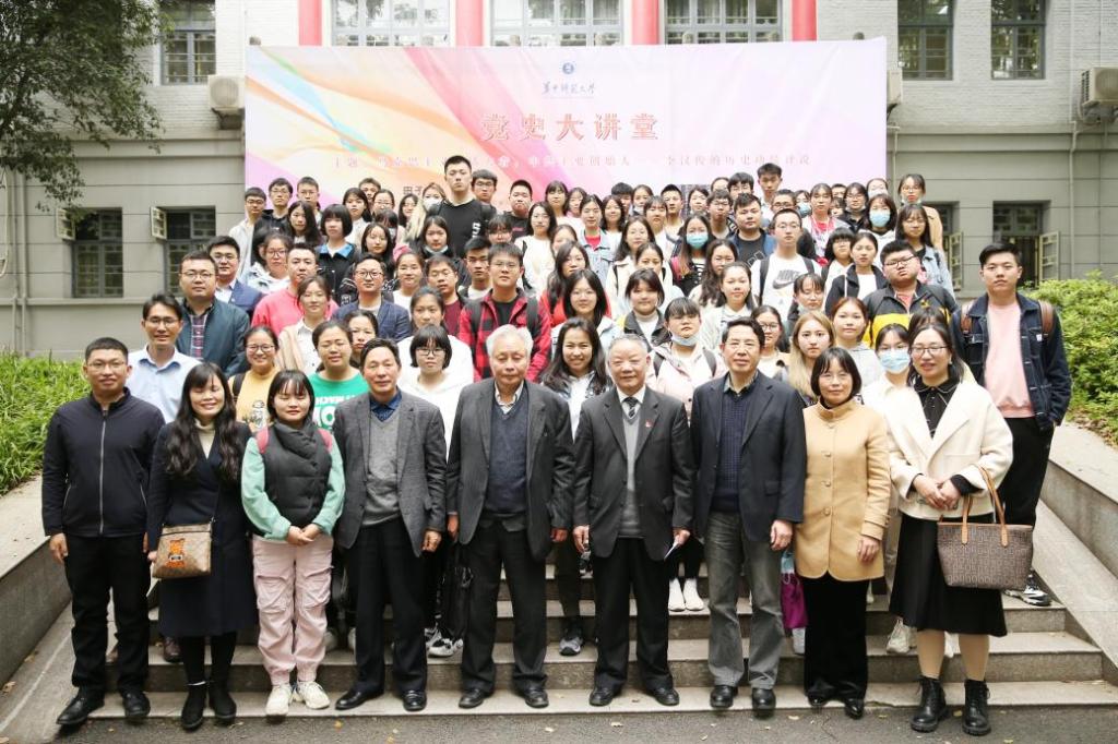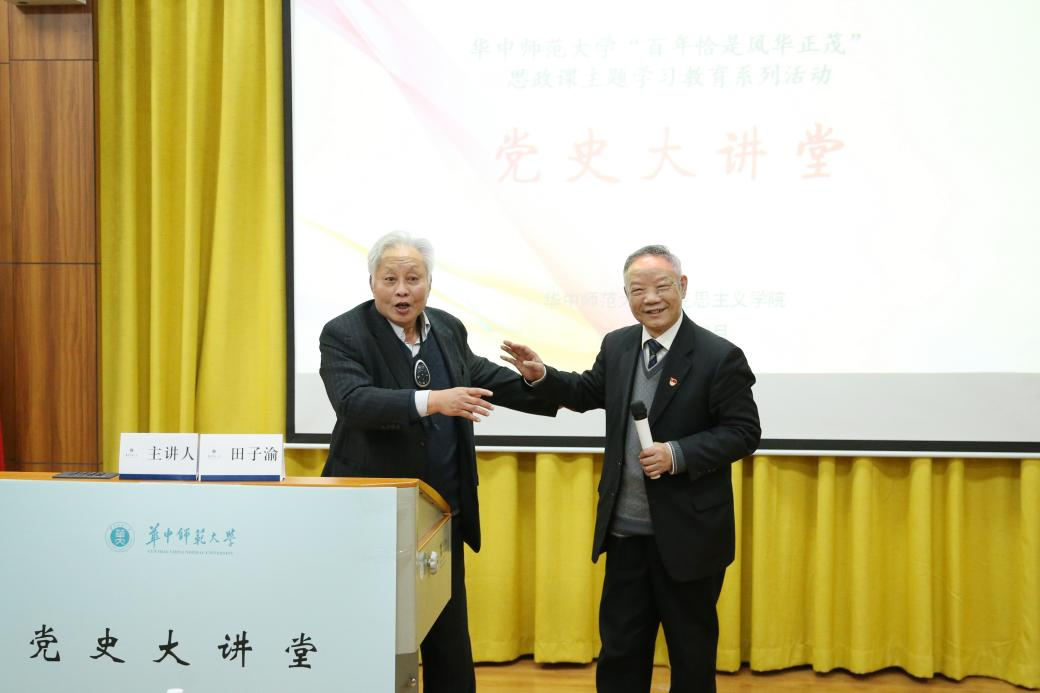 马克思主义学院讯(通讯员:王丹竹)2021年4月10日,华中师范大学马克思主义学院举办的“党史大讲堂”专题讲座在一号楼1101教室举行。湖北大学二级教授、湖北文史研究馆馆员田子渝以“马克思主义的播火者:中共主要创始人——李汉俊的历史功绩评说”为主题,为我校青年学子讲述了李汉俊同志的传奇人生和历史功绩。党史专家、华中师范大学马克思主义学院李良明教授、武汉纺织大学马克思主义学院刘艳教授、华中师范大学历史文化学院孙泽学教授、马克思主义学院思想道德与法治教育教研部部长梅萍教授、湖北省中共党史学会副秘书长、马克思主义学院“四史教研中心”副主任吕惠东副教授、“概论”教研室主任熊富标副教授、马克思主义学院彭菊花副教授、常泓老师等出席讲座活动。本次讲座活动由湖北省中共党史学会副会长、湖北省人文社科重点研究基地“湖北党的建设研究中心”常务副主任、马克思主义学院钟德涛教授主持。