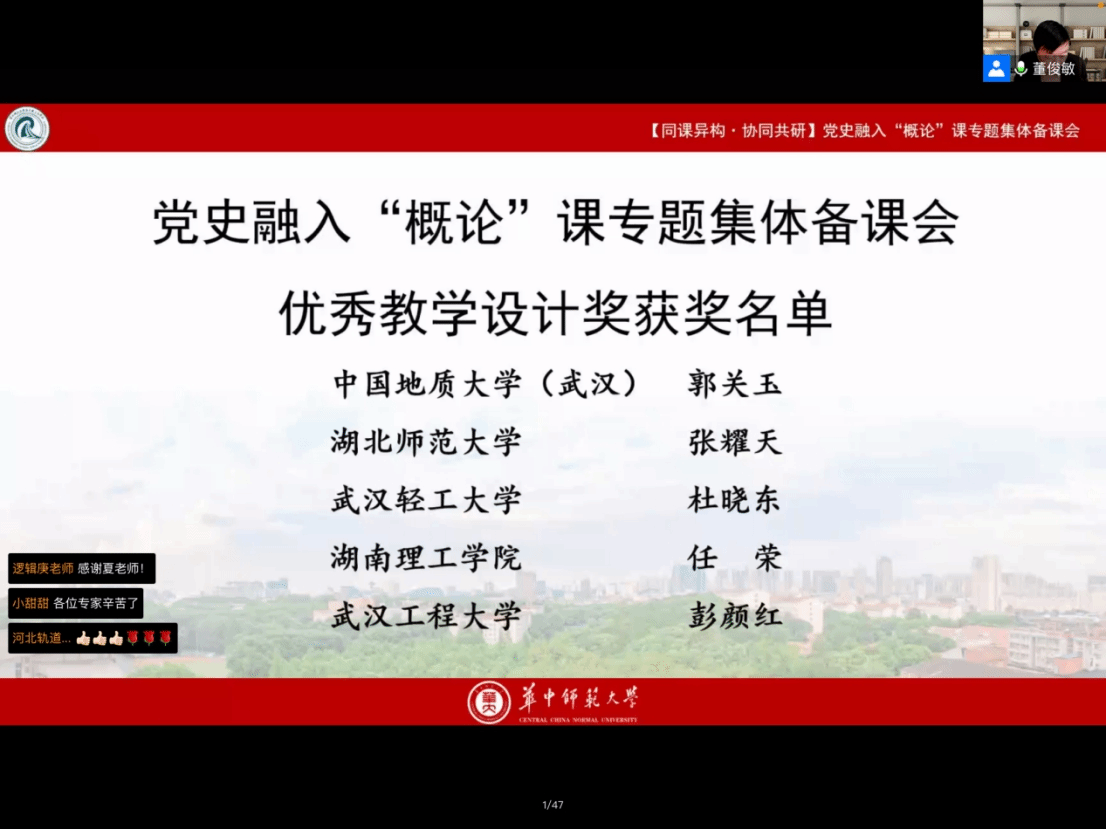 最后,华中师范大学马克思主义学院正处职组织员董俊敏宣读党史融入“概论”课专题教学设计获奖名单,并做总结发言。他指出:我院精心打造的“同课异构 协同共研”集体备课新模式,一经推出,深受一线教师喜爱,吸引了全国众多教师参与,在此十分感谢老师们的分享、指导和参与,欢迎各位老师下次继续参与我们的“同课异构 协同共研”思政课集体备课。