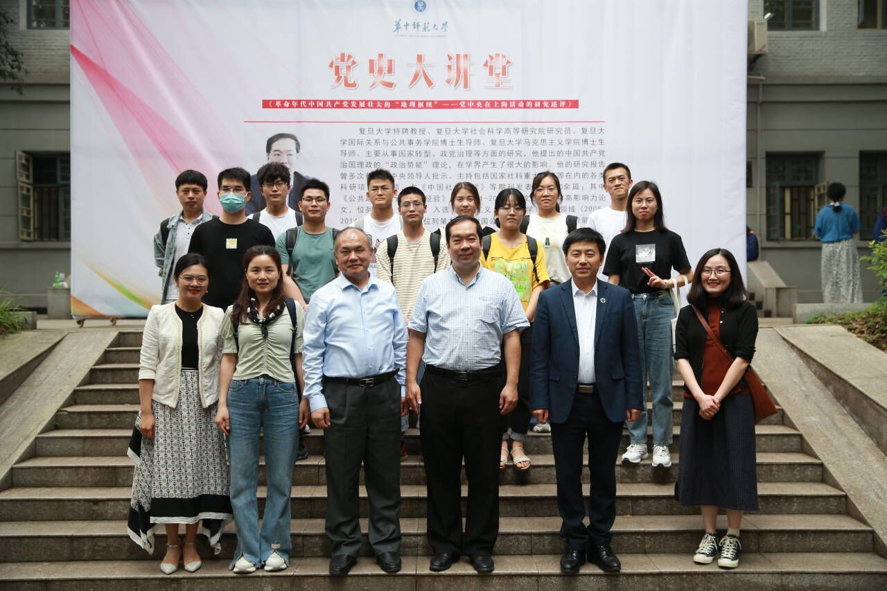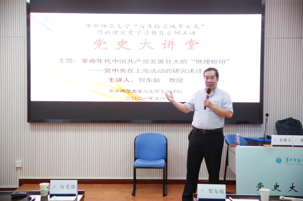 马克思主义学院讯(通讯员:张娇;摄影:张亚鹏)为庆祝中国共产党成立100周年,2021年5月27日,华中师范大学马克思主义学院面向本科生、研究生举办的“百年恰是风华正茂”思政课党史教育系列活动之“党史大讲堂”专题讲座在一号楼三楼学术报告厅举行。学院特邀复旦大学特聘教授、复旦大学社会科学高等研究院贺东航教授做客“党史大讲堂”,作题为《革命年代中国共产党发展壮大的“地理枢纽”——党中央在上海活动的研究述评》的专题讲座,来自校内外百余位师生聆听讲座。本次讲座活动由马克思主义学院院长万美容教授主持。